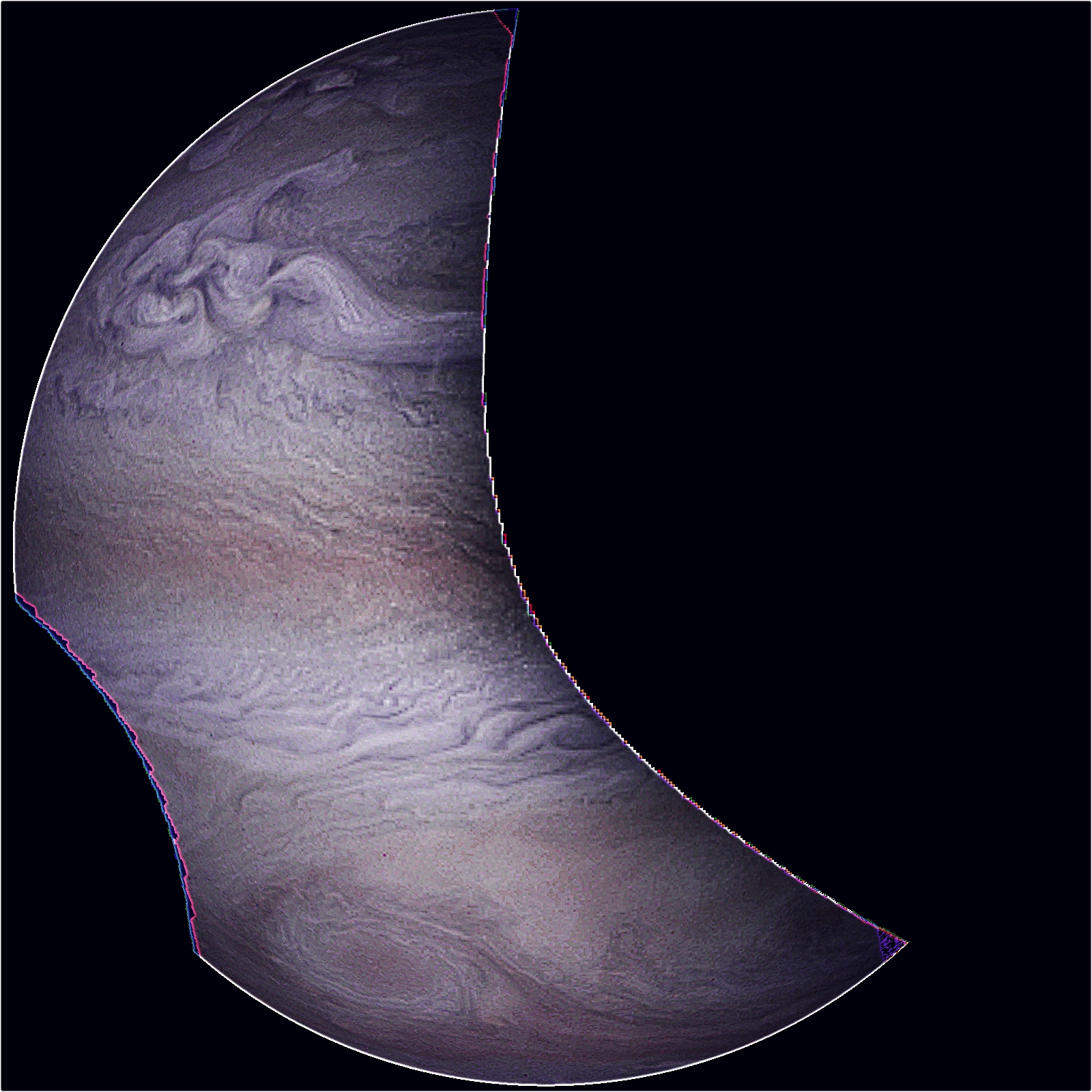 Junocam pixels are 12 bits deep from the camera but are converted to 8 bits inside the instrument using a lossless "companding" table, a process similar to gamma correction, to reduce their size. All Junocam products on the missionjuno website are in this 8-bit form as received on Earth. Scientific users interested in radiometric analysis should use the "RDR" data products archived with the Planetary Data System, which have been converted back to a linear 12-bit scale.