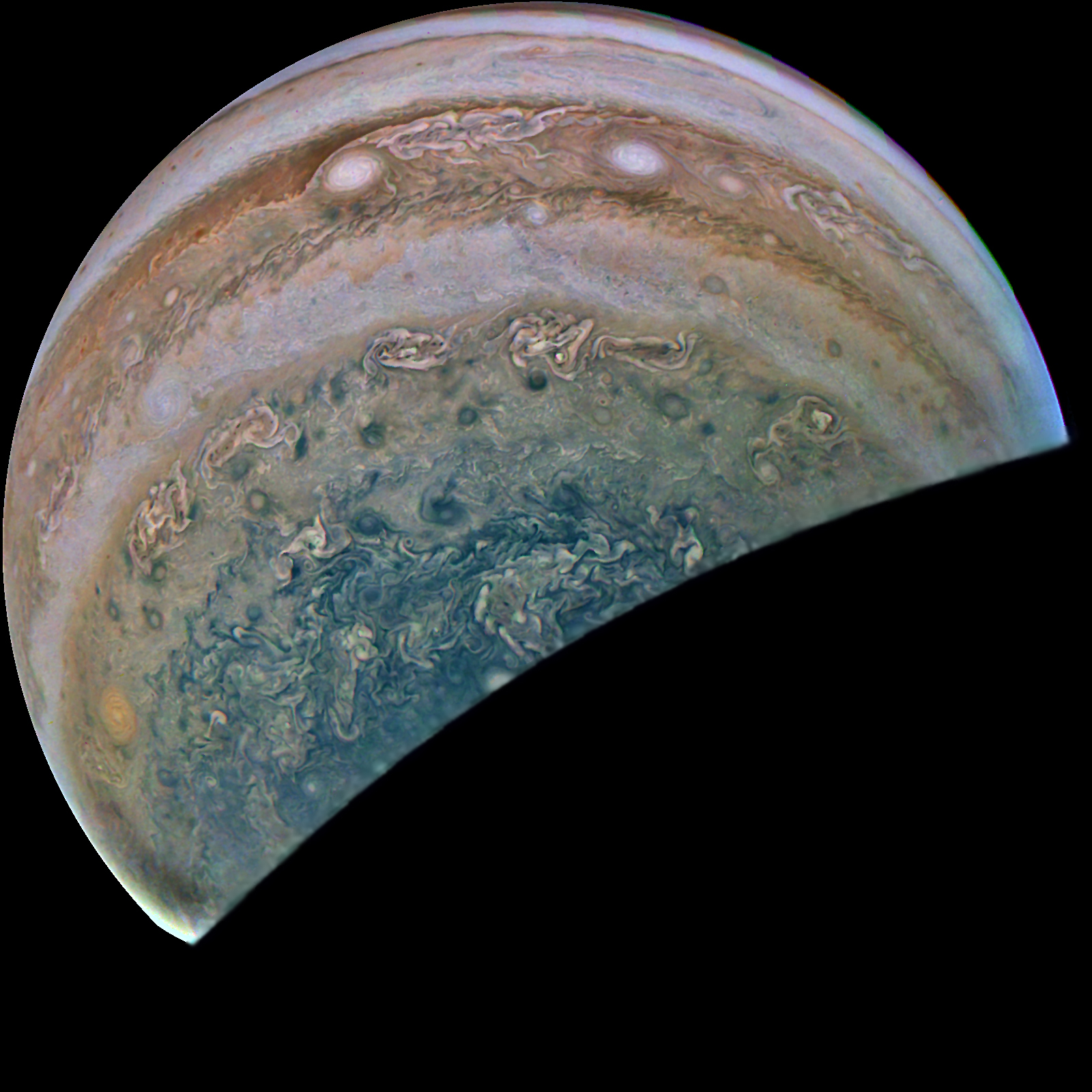 Junocam pixels are 12 bits deep from the camera but are converted to 8 bits inside the instrument using a lossless "companding" table, a process similar to gamma correction, to reduce their size. All Junocam products on the missionjuno website are in this 8-bit form as received on Earth. Scientific users interested in radiometric analysis should use the "RDR" data products archived with the Planetary Data System, which have been converted back to a linear 12-bit scale.