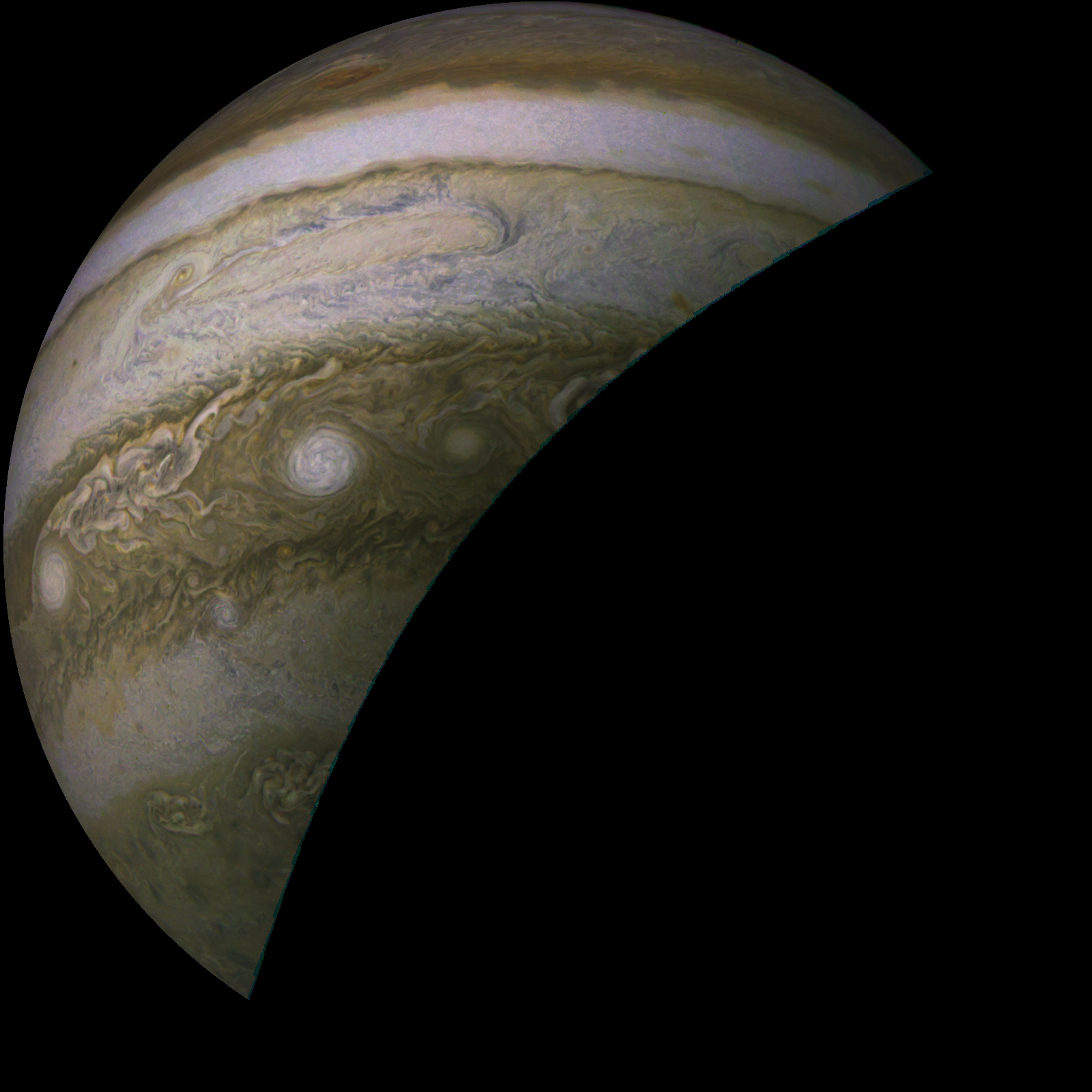 Junocam pixels are 12 bits deep from the camera but are converted to 8 bits inside the instrument using a lossless "companding" table, a process similar to gamma correction, to reduce their size. All Junocam products on the missionjuno website are in this 8-bit form as received on Earth. Scientific users interested in radiometric analysis should use the "RDR" data products archived with the Planetary Data System, which have been converted back to a linear 12-bit scale.