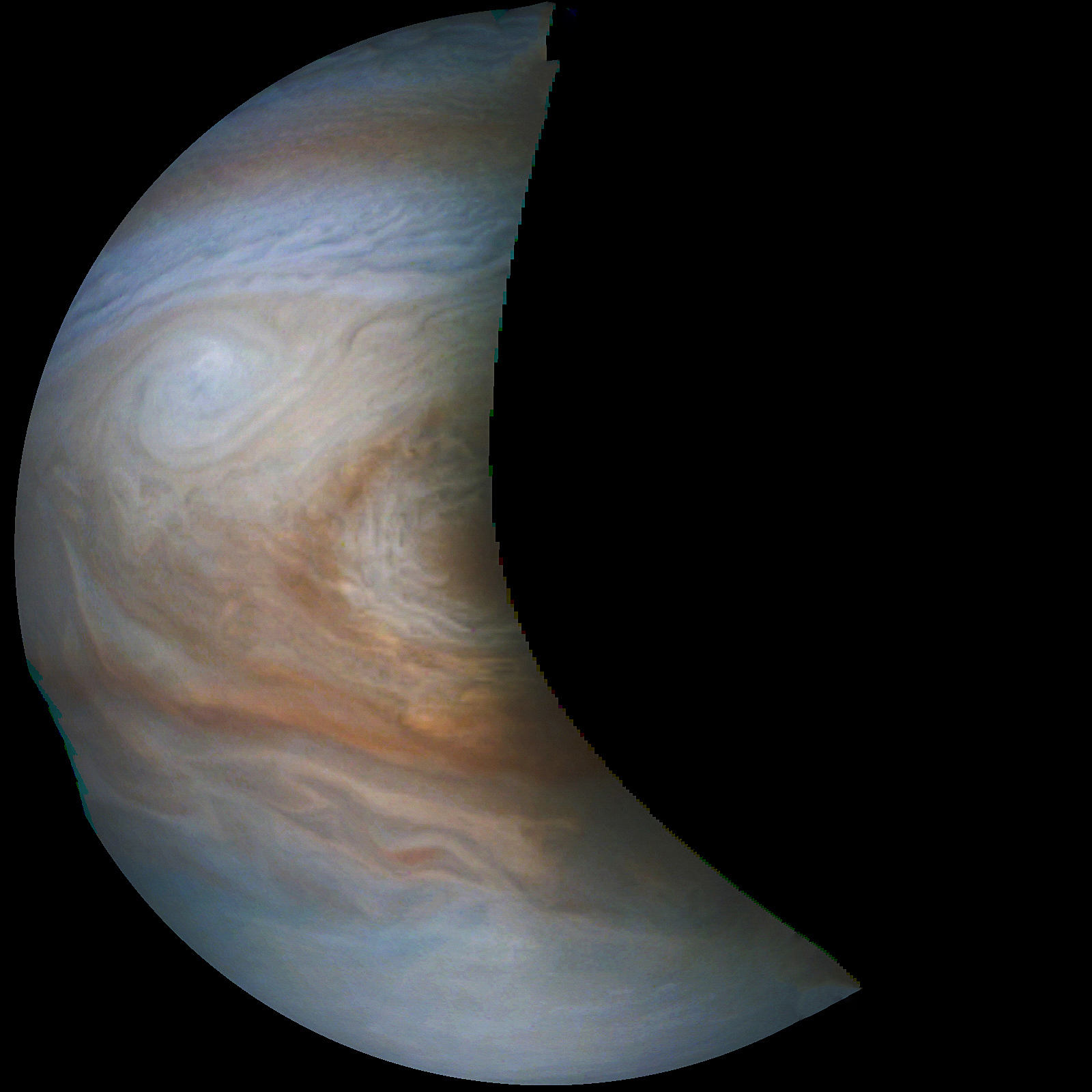 Junocam pixels are 12 bits deep from the camera but are converted to 8 bits inside the instrument using a lossless "companding" table, a process similar to gamma correction, to reduce their size. All Junocam products on the missionjuno website are in this 8-bit form as received on Earth. Scientific users interested in radiometric analysis should use the "RDR" data products archived with the Planetary Data System, which have been converted back to a linear 12-bit scale.