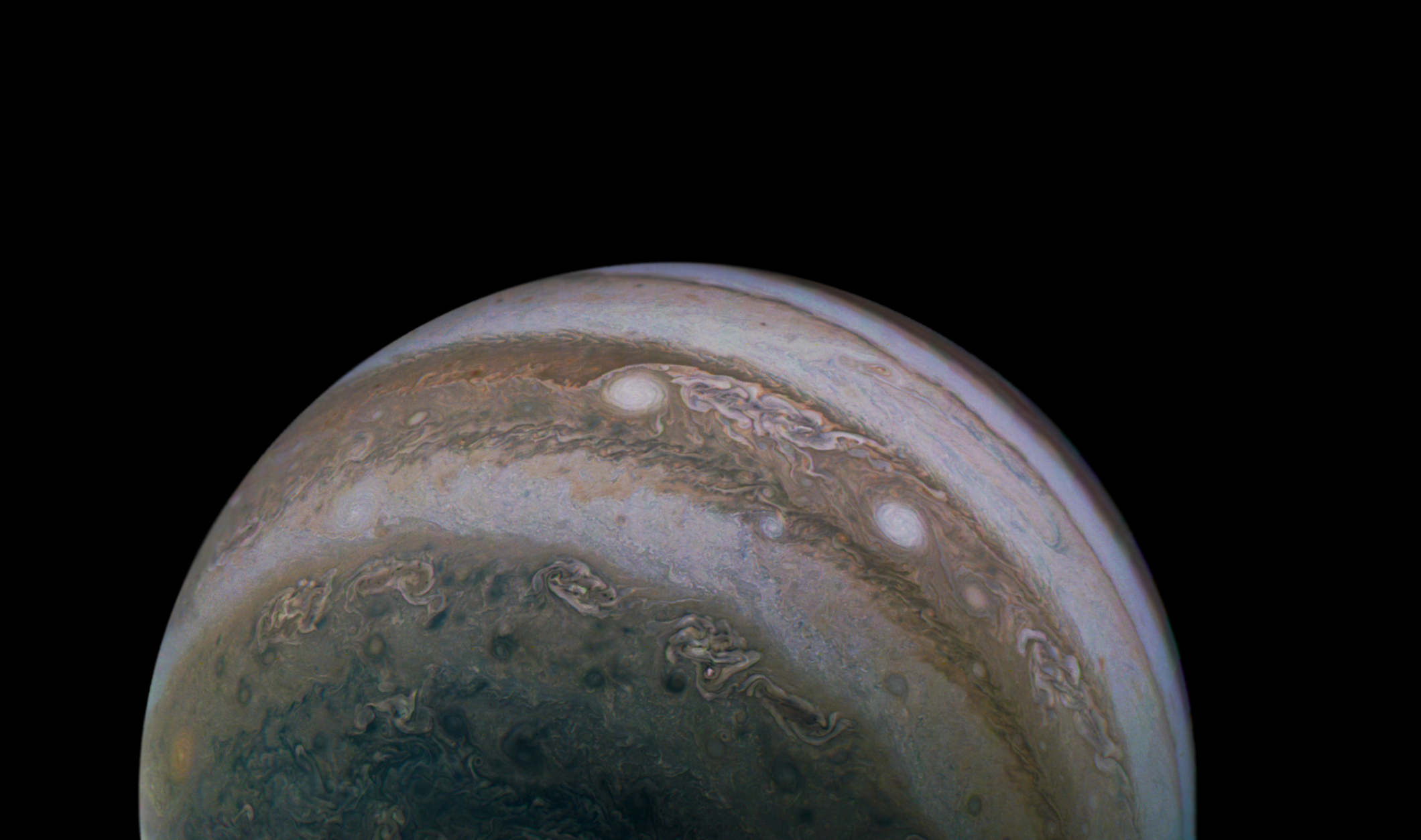 Junocam pixels are 12 bits deep from the camera but are converted to 8 bits inside the instrument using a lossless "companding" table, a process similar to gamma correction, to reduce their size. All Junocam products on the missionjuno website are in this 8-bit form as received on Earth. Scientific users interested in radiometric analysis should use the "RDR" data products archived with the Planetary Data System, which have been converted back to a linear 12-bit scale.