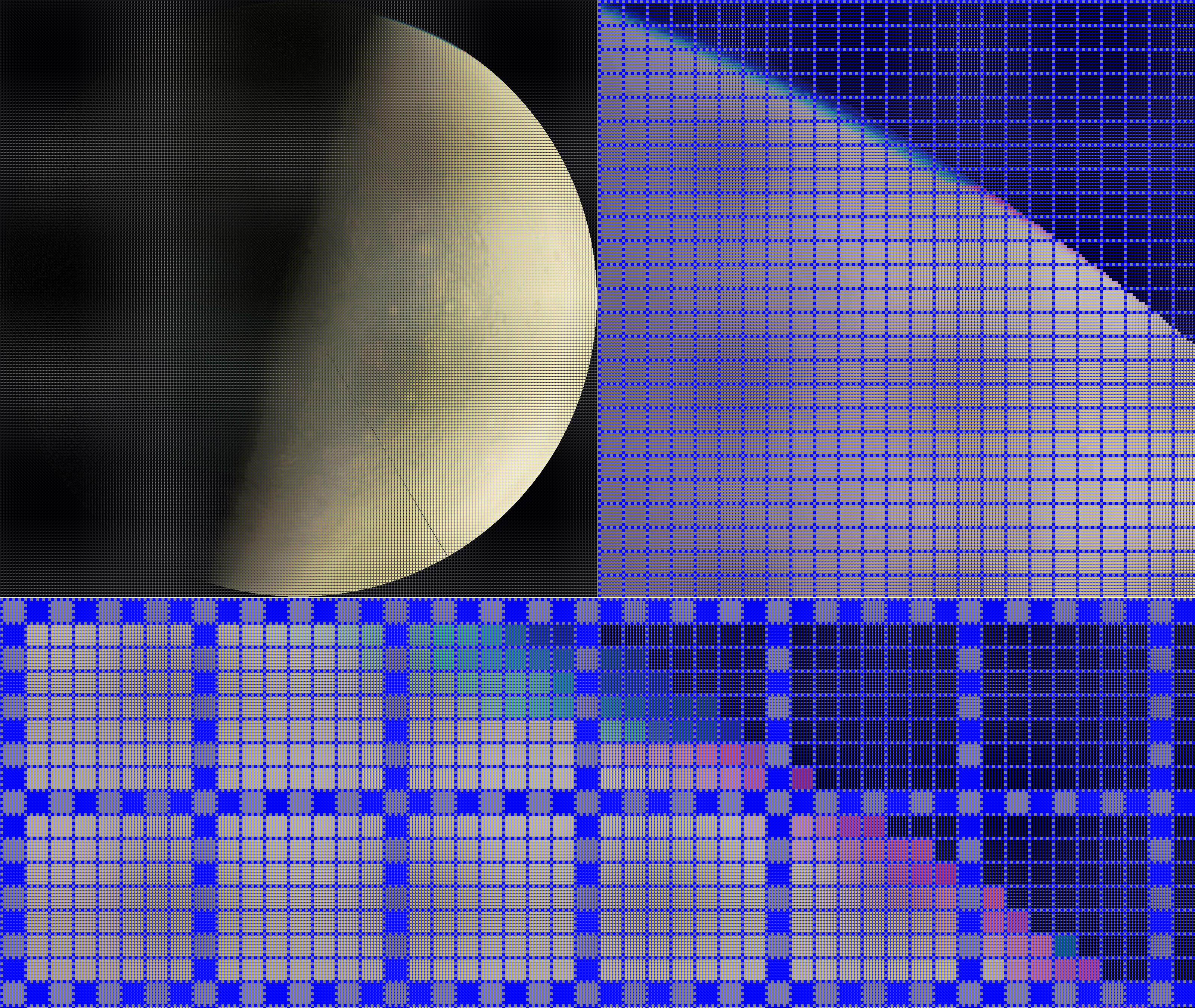 Digital Art Color Experiment. 'South pole at minimum emission angle' processed on Windows and Windows Paint. Processes: Windows Paint Grid at zoom x8 was 'Print Screened' and applied at the front of the image. Than a random area from the image is zoomed at x8; a command Grid is applied; command 'Print Screen' and than the image area is Cropped. Than a random area from the zoom x8 Cropped image is zoomed at x8; a command Grid is applied again; command 'Print Screen' and than the image area is Cropped. Inverted Colors. Monochrome. Colored [the colors from the Juno on-line Game were used]; Inverted Colors.