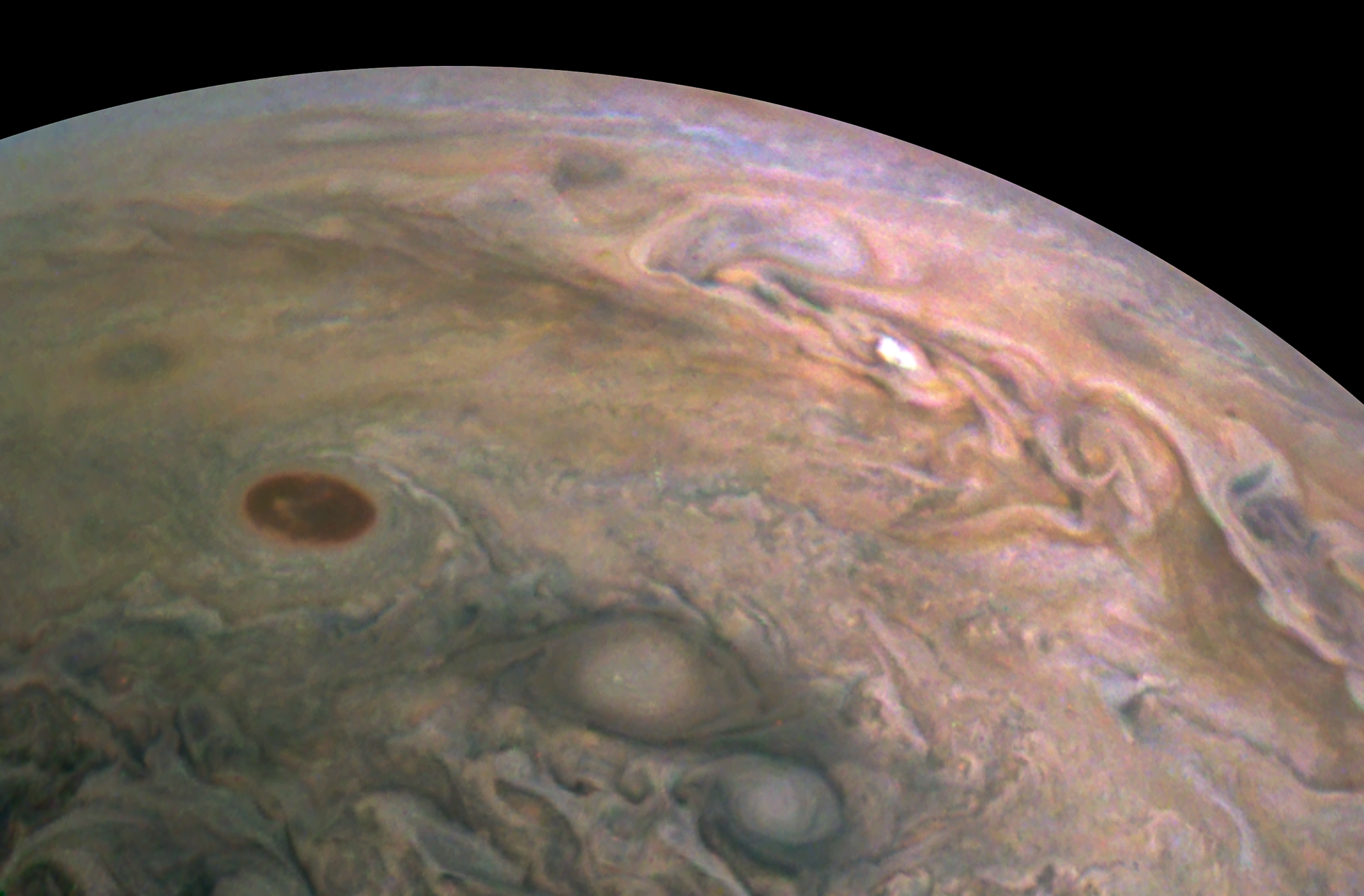 Junocam pixels are 12 bits deep from the camera but are converted to 8 bits inside the instrument using a lossless "companding" table, a process similar to gamma correction, to reduce their size. All Junocam products on the missionjuno website are in this 8-bit form as received on Earth. Scientific users interested in radiometric analysis should use the "RDR" data products archived with the Planetary Data System, which have been converted back to a linear 12-bit scale.