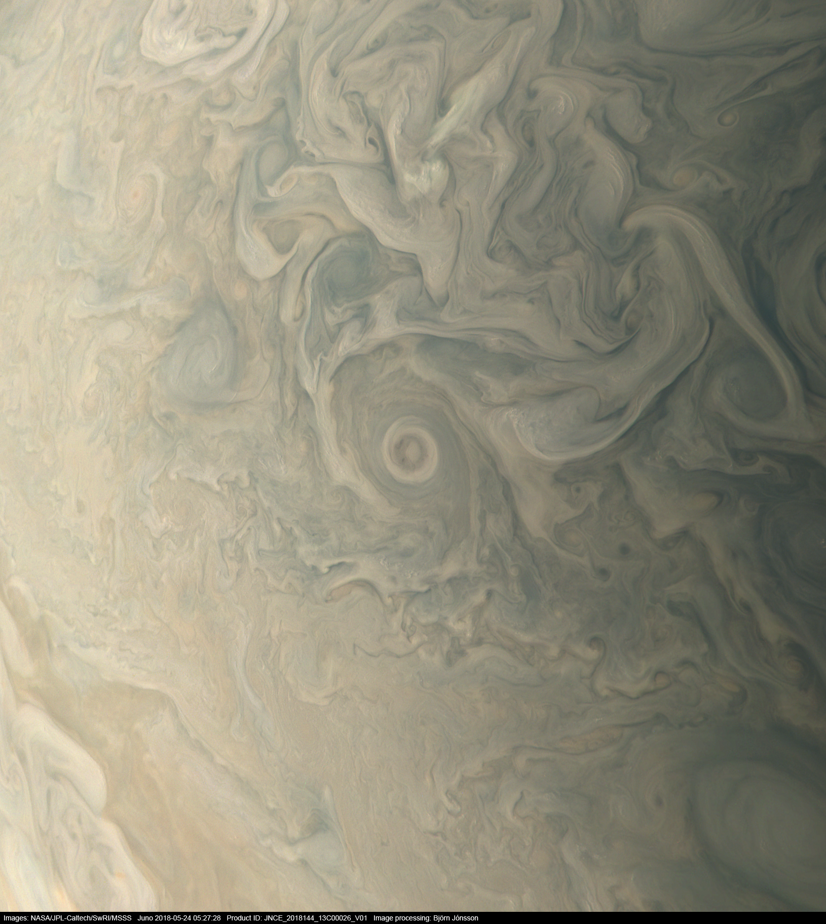 A view centered on a beautiful vortex near latitude 48 degrees north. This is an approximately true color/contrast image processed from the raw image PJ13_26 framelets.