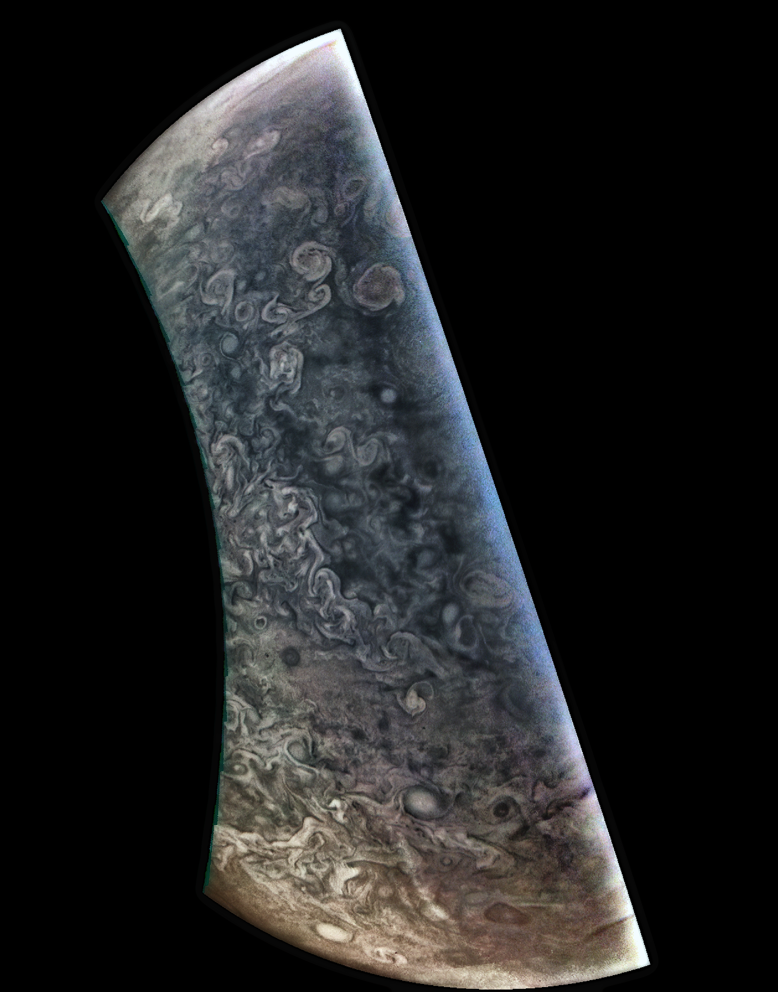 Junocam pixels are 12 bits deep from the camera but are converted to 8 bits inside the instrument using a lossless "companding" table, a process similar to gamma correction, to reduce their size. All Junocam products on the missionjuno website are in this 8-bit form as received on Earth. Scientific users interested in radiometric analysis should use the "RDR" data products archived with the Planetary Data System, which have been converted back to a linear 12-bit scale.