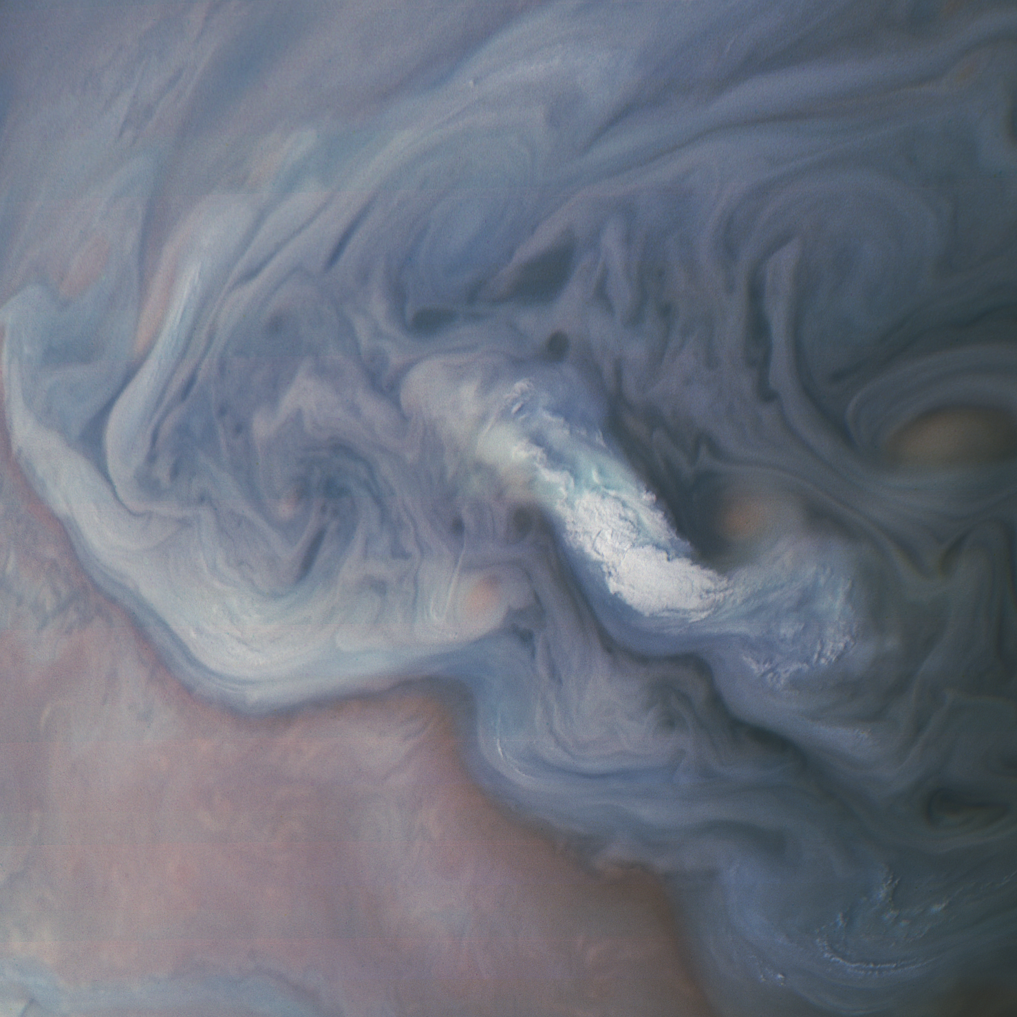 Junocam pixels are 12 bits deep from the camera but are converted to 8 bits inside the instrument using a lossless "companding" table, a process similar to gamma correction, to reduce their size. All Junocam products on the missionjuno website are in this 8-bit form as received on Earth. Scientific users interested in radiometric analysis should use the "RDR" data products archived with the Planetary Data System, which have been converted back to a linear 12-bit scale.