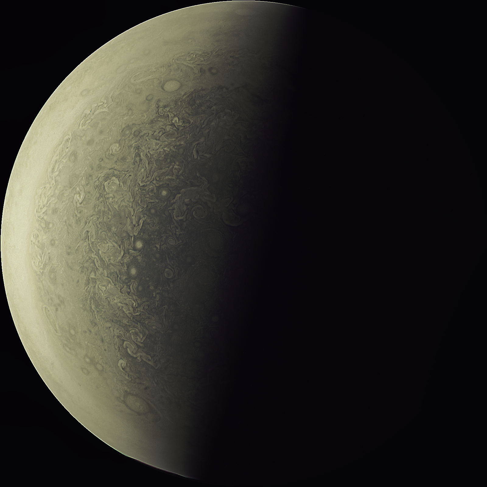 Junocam pixels are 12 bits deep from the camera but are converted to 8 bits inside the instrument using a lossless "companding" table, a process similar to gamma correction, to reduce their size. All Junocam products on the missionjuno website are in this 8-bit form as received on Earth. Scientific users interested in radiometric analysis should use the "RDR" data products archived with the Planetary Data System, which have been converted back to a linear 12-bit scale.