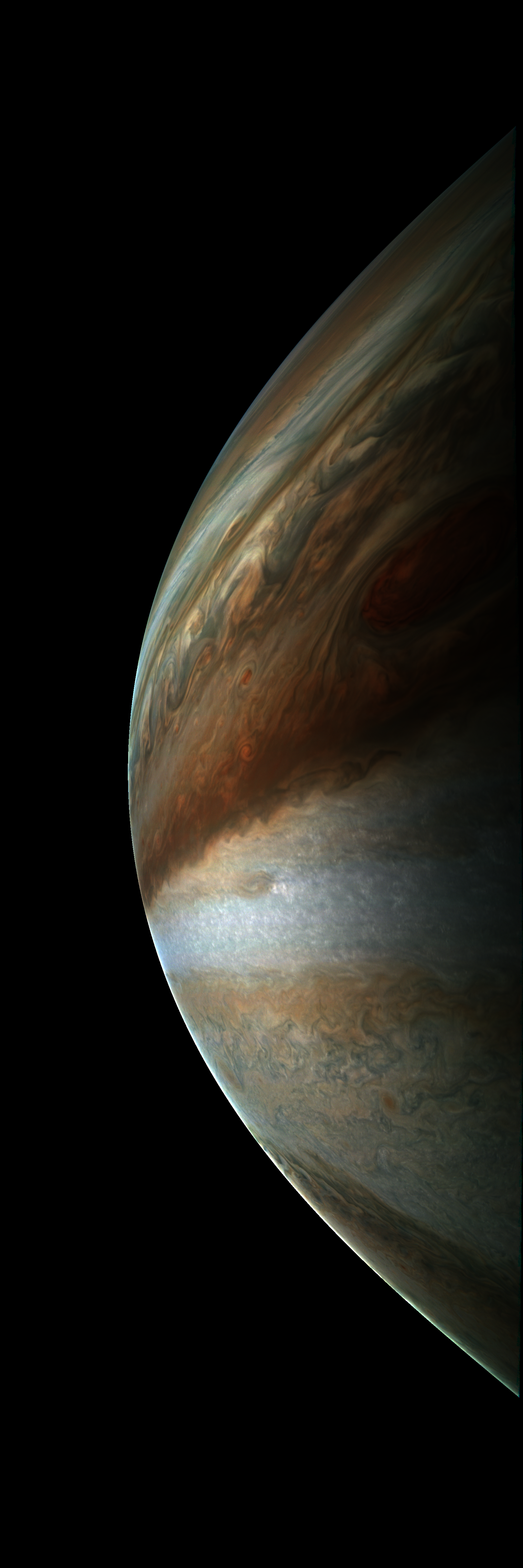 Junocam pixels are 12 bits deep from the camera but are converted to 8 bits inside the instrument using a lossless "companding" table, a process similar to gamma correction, to reduce their size. All Junocam products on the missionjuno website are in this 8-bit form as received on Earth. Scientific users interested in radiometric analysis should use the "RDR" data products archived with the Planetary Data System, which have been converted back to a linear 12-bit scale.