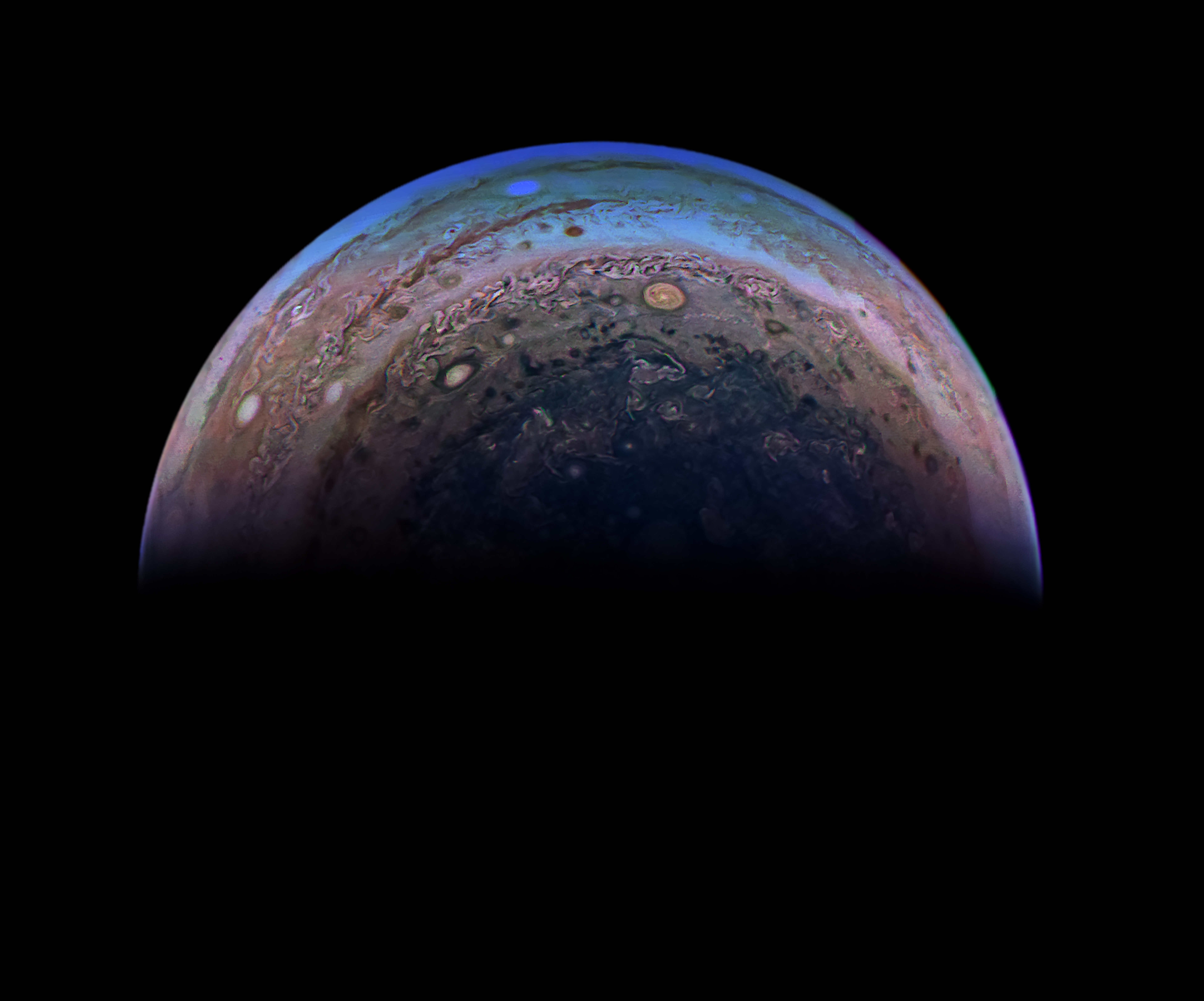 Junocam pixels are 12 bits deep from the camera but are converted to 8 bits inside the instrument using a lossless "companding" table, a process similar to gamma correction, to reduce their size. All Junocam products on the missionjuno website are in this 8-bit form as received on Earth. Scientific users interested in radiometric analysis should use the "RDR" data products archived with the Planetary Data System, which have been converted back to a linear 12-bit scale.