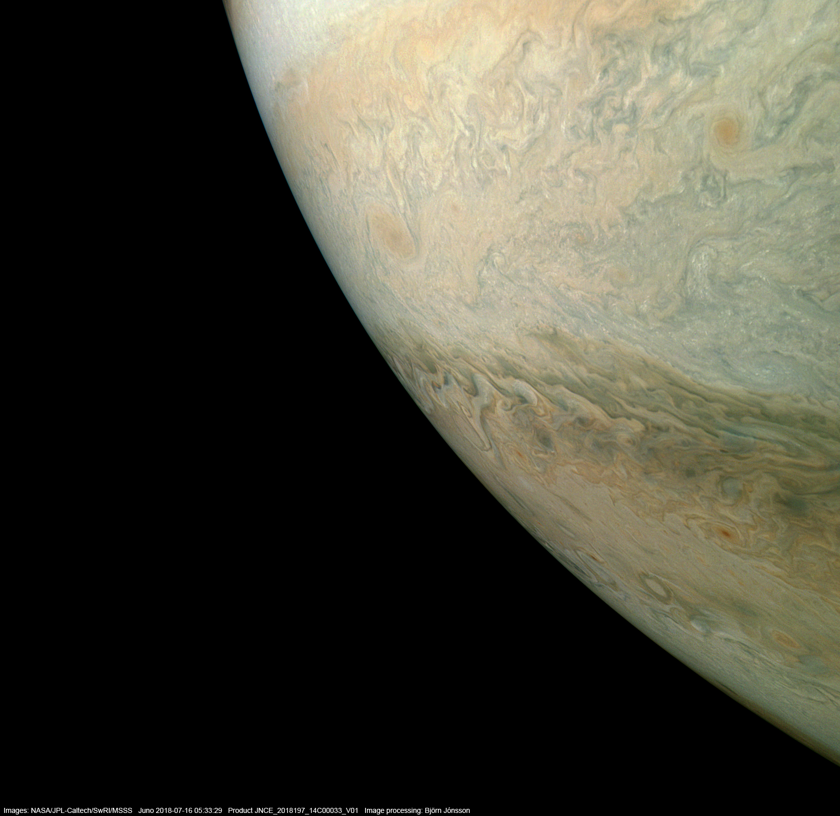 An image processed from the raw image PJ14_33 framelets. The color and contrast is exaggerated in this image and small scale features have been sharpened.