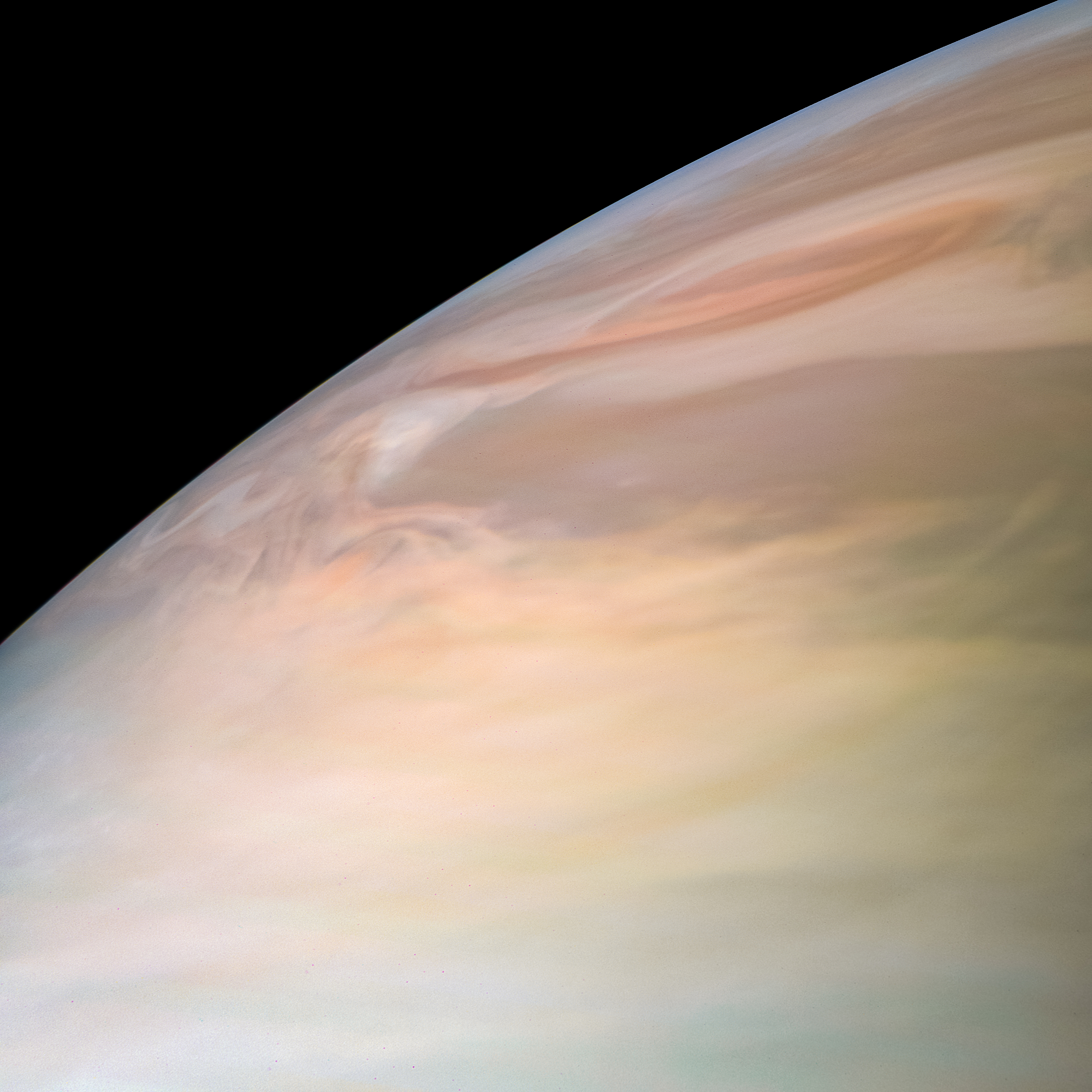 Junocam pixels are 12 bits deep from the camera but are converted to 8 bits inside the instrument using a lossless "companding" table, a process similar to gamma correction, to reduce their size. All Junocam products on the missionjuno website are in this 8-bit form as received on Earth. Scientific users interested in radiometric analysis should use the "RDR" data products archived with the Planetary Data System, which have been converted back to a linear 12-bit scale.