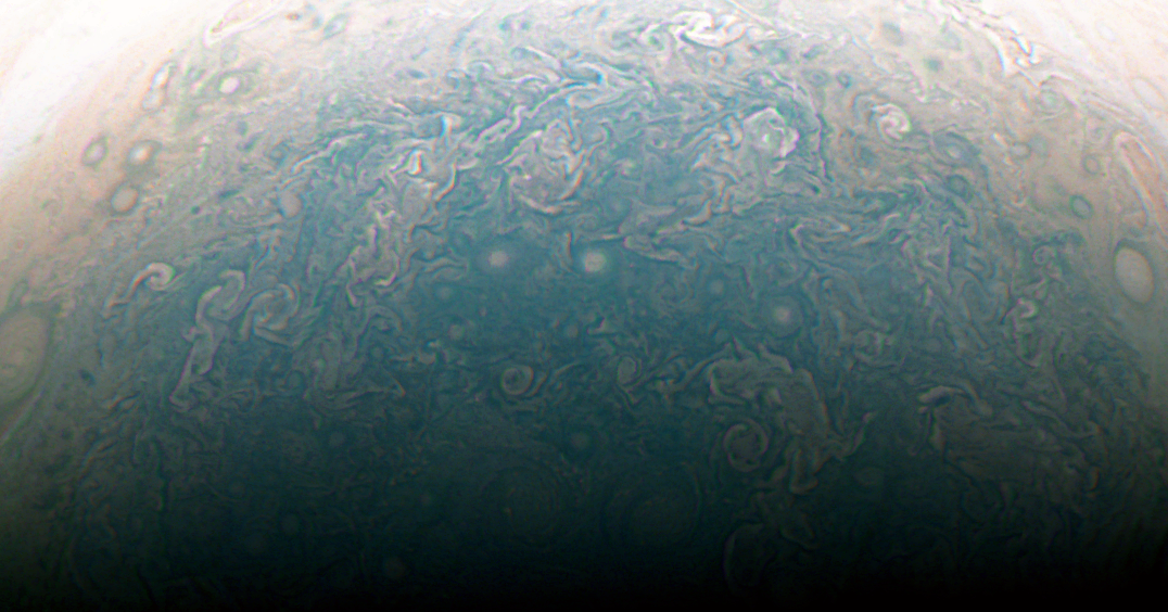 First, raw images of each color channel were normalized, then - composed as final RGB image. Software used: GIMP 2.8.2. Raw images source: https://www.missionjuno.swri.edu/junocam/processing?id=350