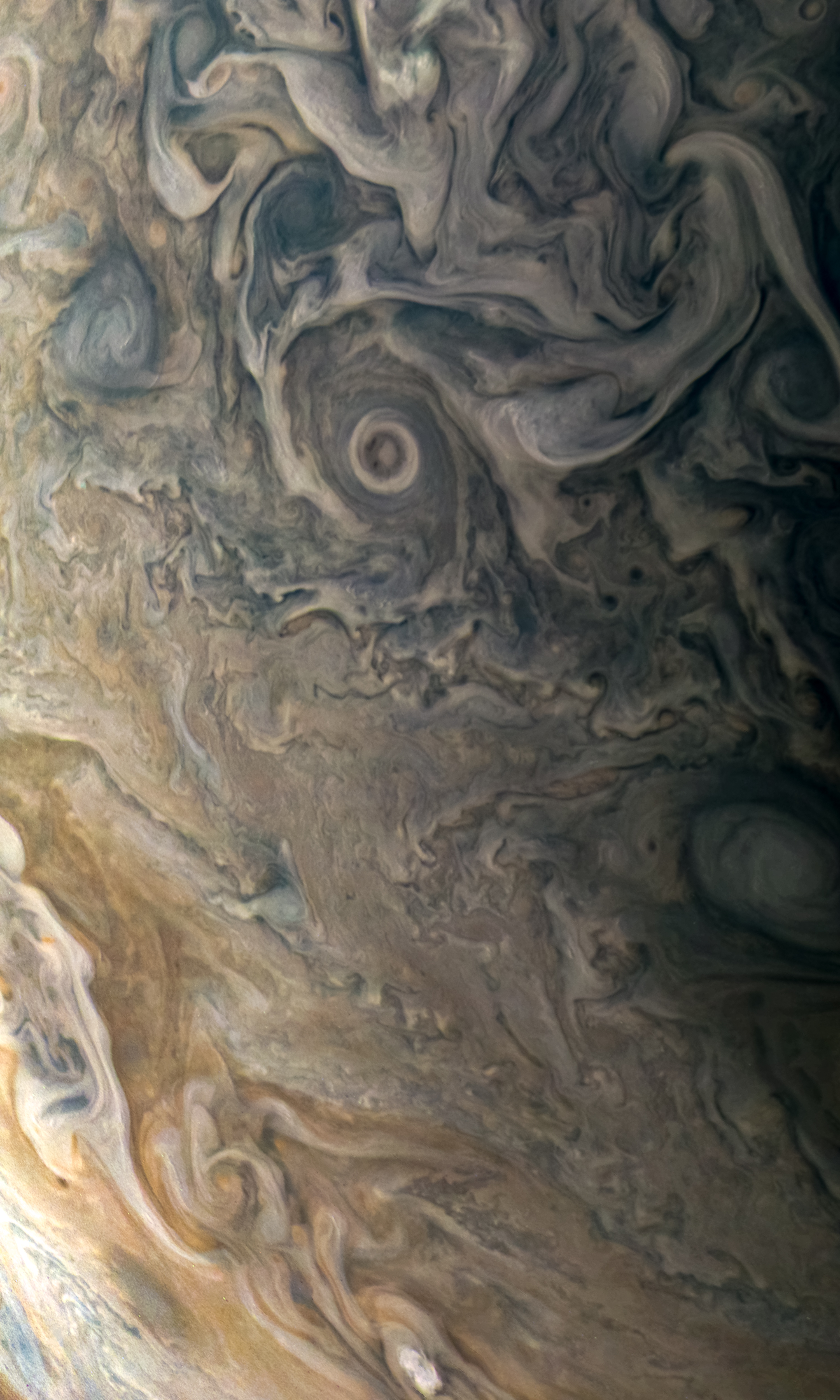 Junocam pixels are 12 bits deep from the camera but are converted to 8 bits inside the instrument using a lossless "companding" table, a process similar to gamma correction, to reduce their size. All Junocam products on the missionjuno website are in this 8-bit form as received on Earth. Scientific users interested in radiometric analysis should use the "RDR" data products archived with the Planetary Data System, which have been converted back to a linear 12-bit scale.