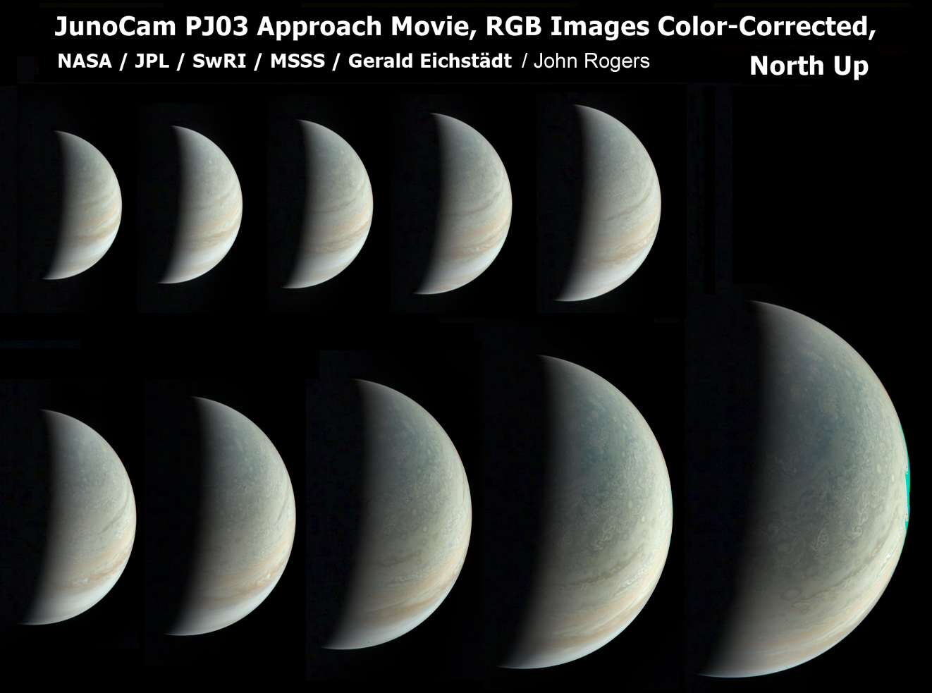 These are the last ten inbound images, before the perijove sequence, showing the northern hemisphere. They are contrast-enhanced versions of those assembled and processed by Gerald Eichstädt.