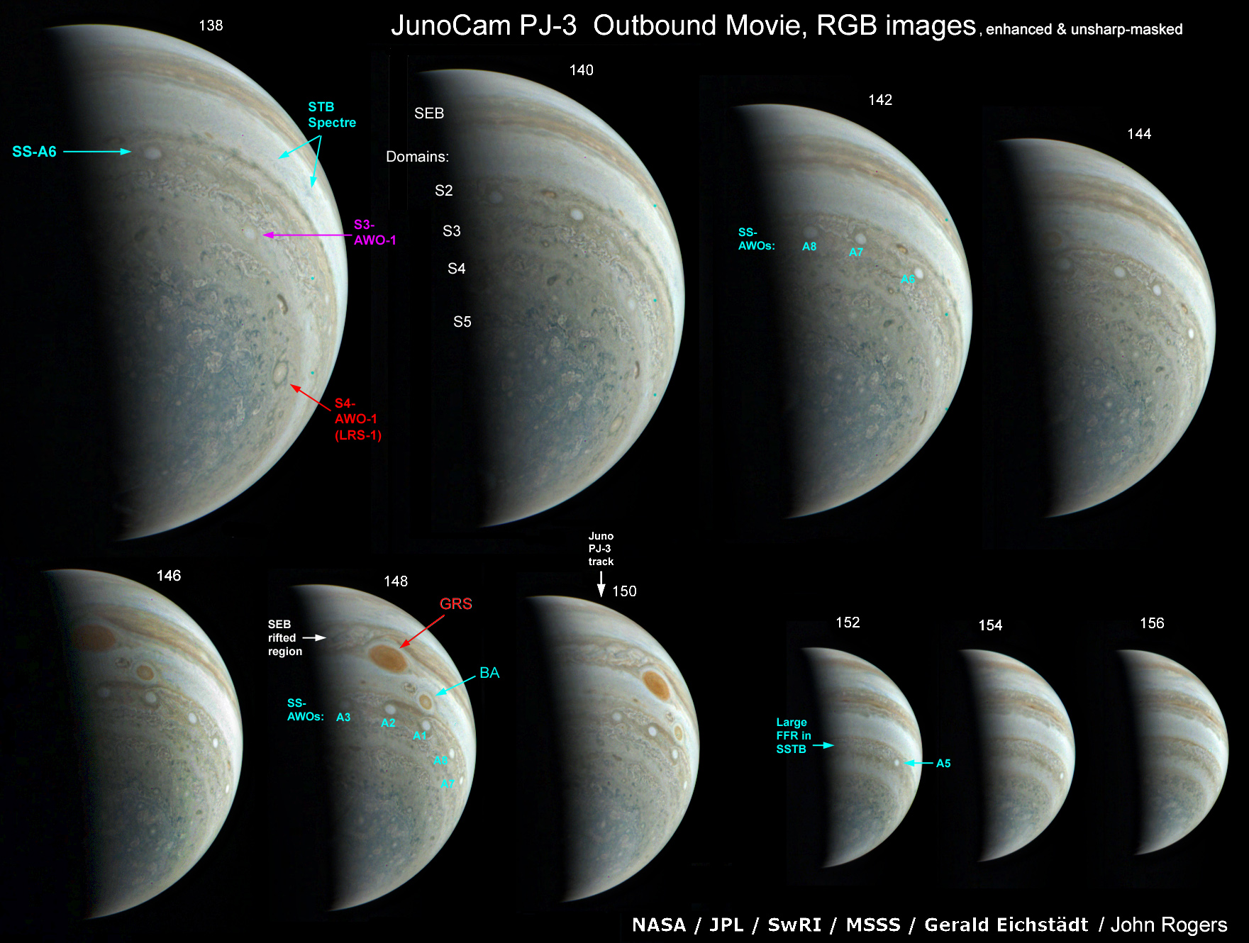 For completeness, here are the best images just after Perijove-3 on 2016 Dec.11, labelled to show the major features. These are the first ten after the perijove sequence (showing the southern hemisphere), as in the previous post, unsharp-masked and labelled by John Rogers.