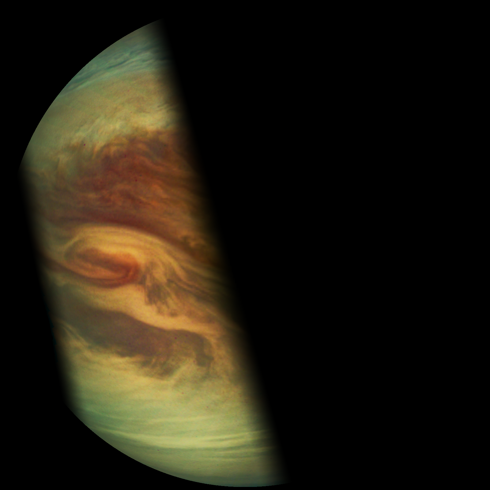 Junocam pixels are 12 bits deep from the camera but are converted to 8 bits inside the instrument using a lossless "companding" table, a process similar to gamma correction, to reduce their size. All Junocam products on the missionjuno website are in this 8-bit form as received on Earth. Scientific users interested in radiometric analysis should use the "RDR" data products archived with the Planetary Data System, which have been converted back to a linear 12-bit scale.