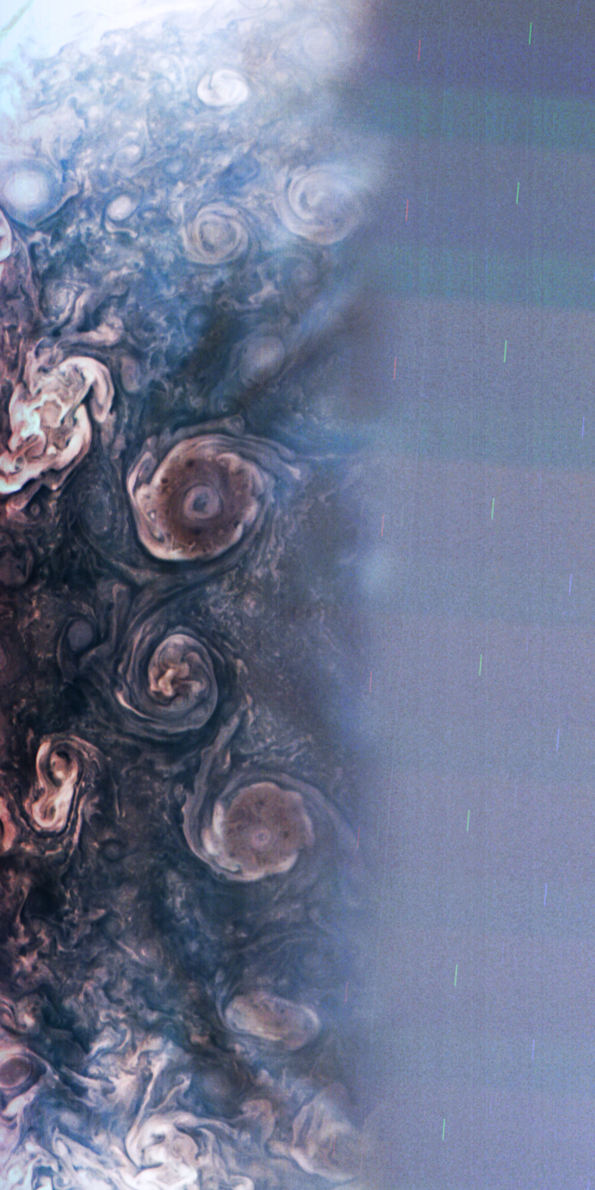 The image is derived from JunoCam image #6163. It has been taken early during perijove-1. Higher exposure time and few compression artifacts allowed for 4-fold supersampling with respect to the raw data, and for considerable subsequent enhancement. All these factors taken together reveal stunning detail.
