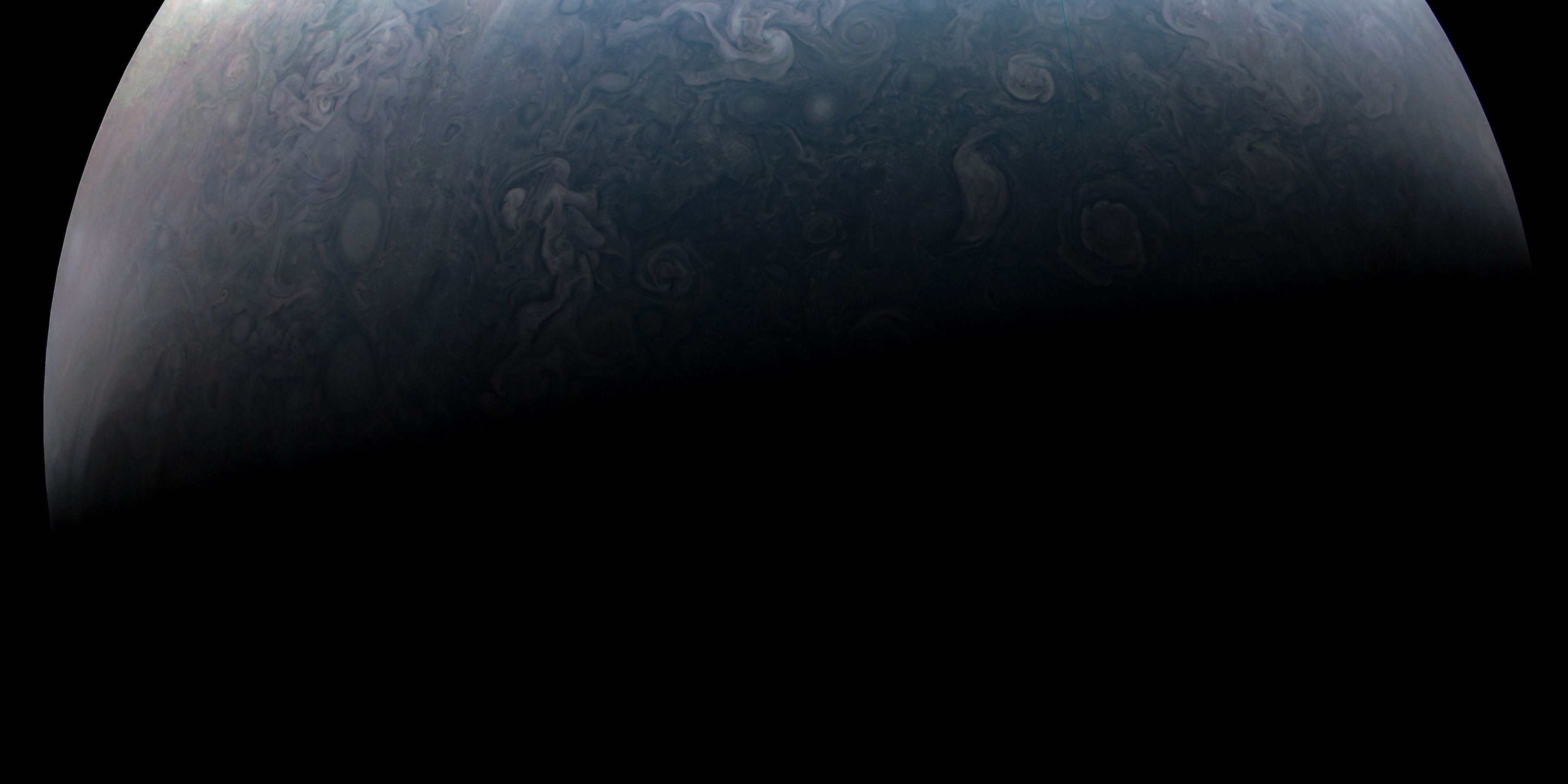 Junocam pixels are 12 bits deep from the camera but are converted to 8 bits inside the instrument using a lossless "companding" table, a process similar to gamma correction, to reduce their size. All Junocam products on the missionjuno website are in this 8-bit form as received on Earth. Scientific users interested in radiometric analysis should use the "RDR" data products archived with the Planetary Data System, which have been converted back to a linear 12-bit scale.