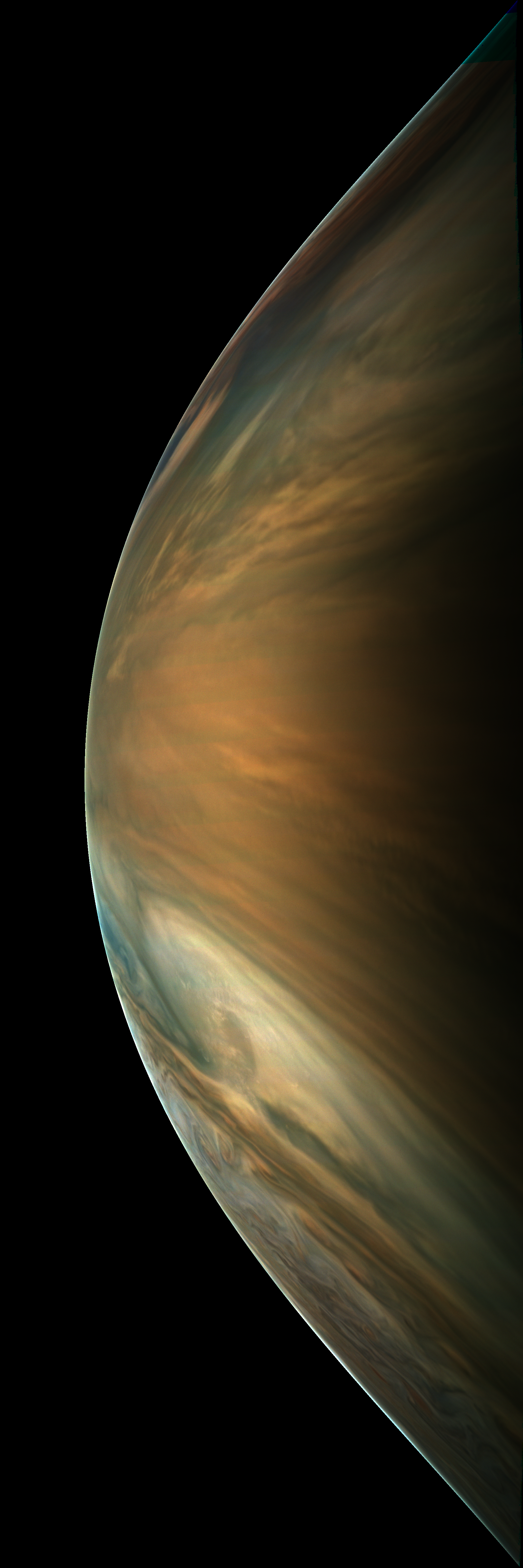 Resolution is 30 pixels per degrees in an equdistant cylindrical system centered to the camera at image stop time, with an axis parallel to Juno's spin axis. The rendered field of view is 60x180 degrees.