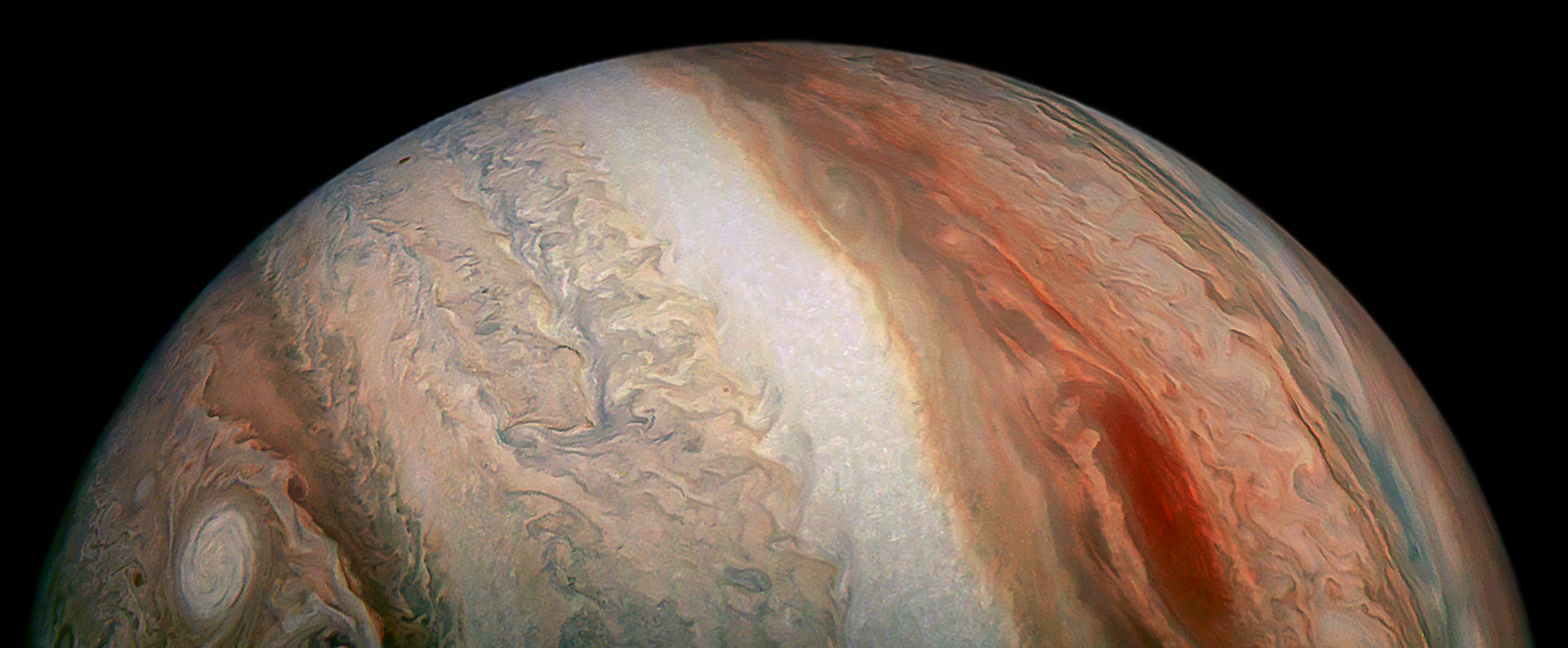 Junocam pixels are 12 bits deep from the camera but are converted to 8 bits inside the instrument using a lossless "companding" table, a process similar to gamma correction, to reduce their size. All Junocam products on the missionjuno website are in this 8-bit form as received on Earth. Scientific users interested in radiometric analysis should use the "RDR" data products archived with the Planetary Data System, which have been converted back to a linear 12-bit scale.