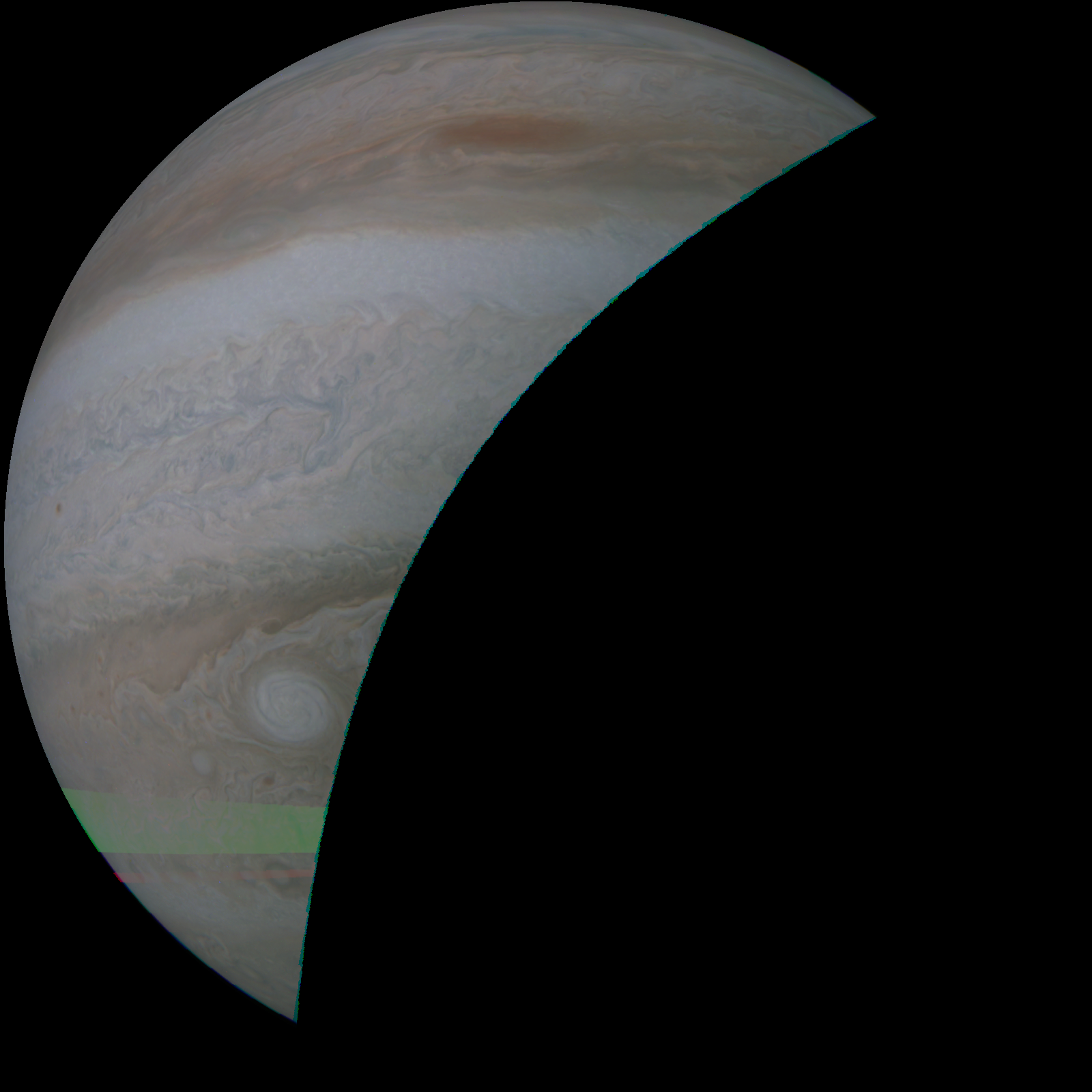 Junocam pixels are 12 bits deep from the camera but are converted to 8 bits inside the instrument using a lossless "companding" table, a process similar to gamma correction, to reduce their size. All Junocam products on the missionjuno website are in this 8-bit form as received on Earth. Scientific users interested in radiometric analysis should use the "RDR" data products archived with the Planetary Data System, which have been converted back to a linear 12-bit scale.