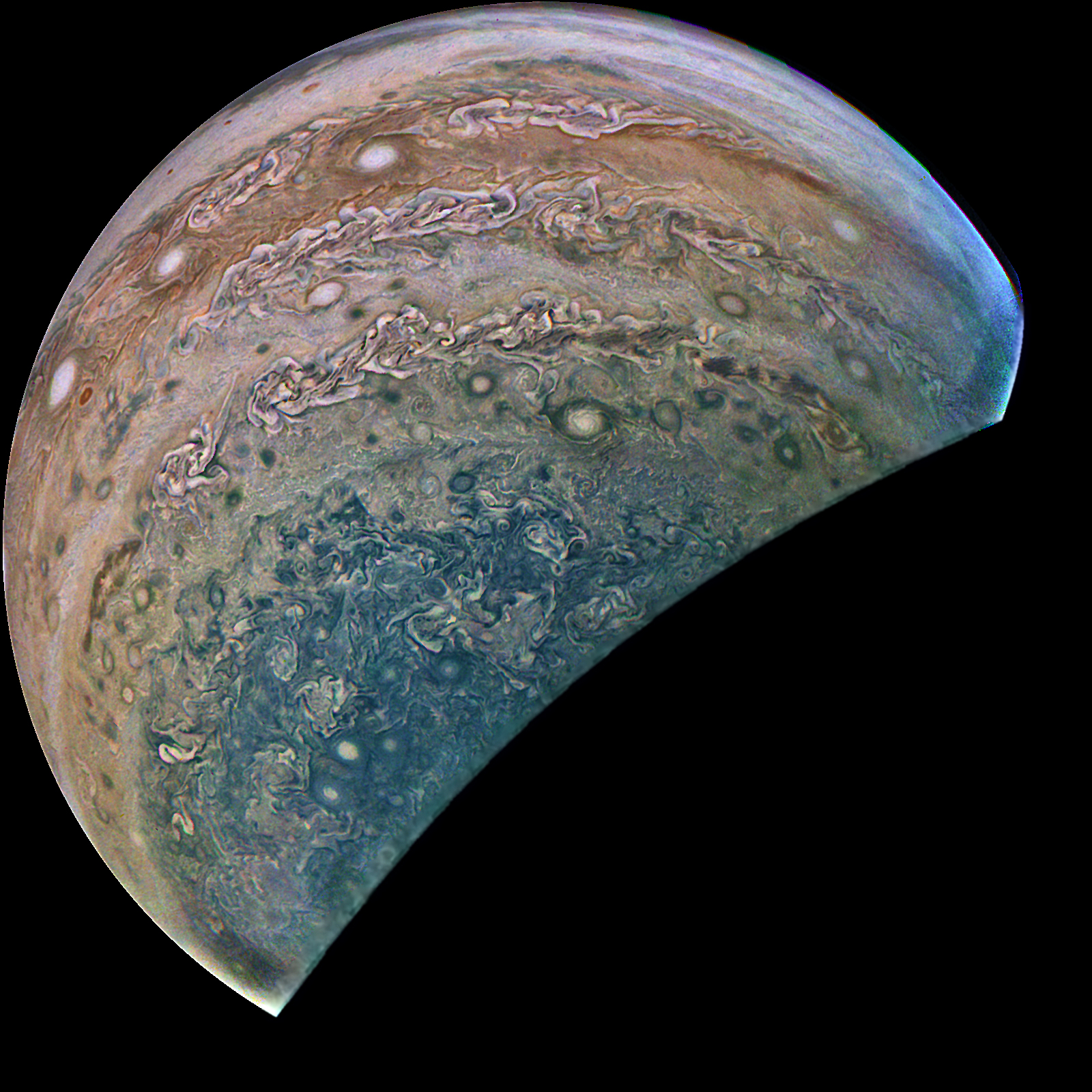 Junocam pixels are 12 bits deep from the camera but are converted to 8 bits inside the instrument using a lossless "companding" table, a process similar to gamma correction, to reduce their size. All Junocam products on the missionjuno website are in this 8-bit form as received on Earth. Scientific users interested in radiometric analysis should use the "RDR" data products archived with the Planetary Data System, which have been converted back to a linear 12-bit scale.