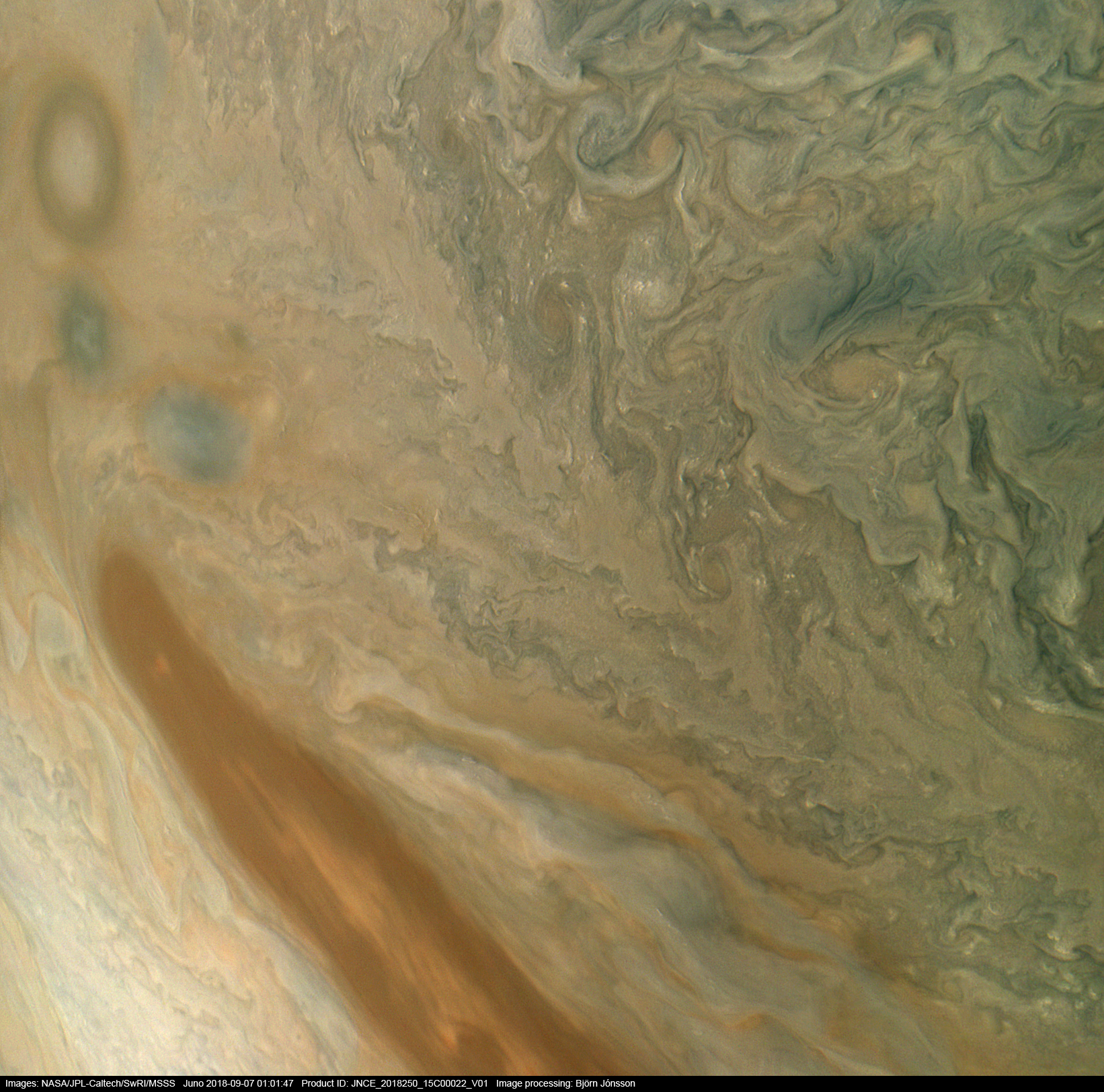 An image processed from the raw PJ15_22 image framelets. The contrast/color has been exaggerated and small scale features sharpened.