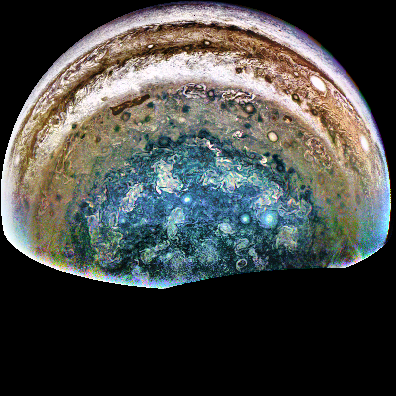 Junocam pixels are 12 bits deep from the camera but are converted to 8 bits inside the instrument using a lossless "companding" table, a process similar to gamma correction, to reduce their size. All Junocam products on the missionjuno website are in this 8-bit form as received on Earth. Scientific users interested in radiometric analysis should use the "RDR" data products archived with the Planetary Data System, which have been converted back to a linear 12-bit scale.