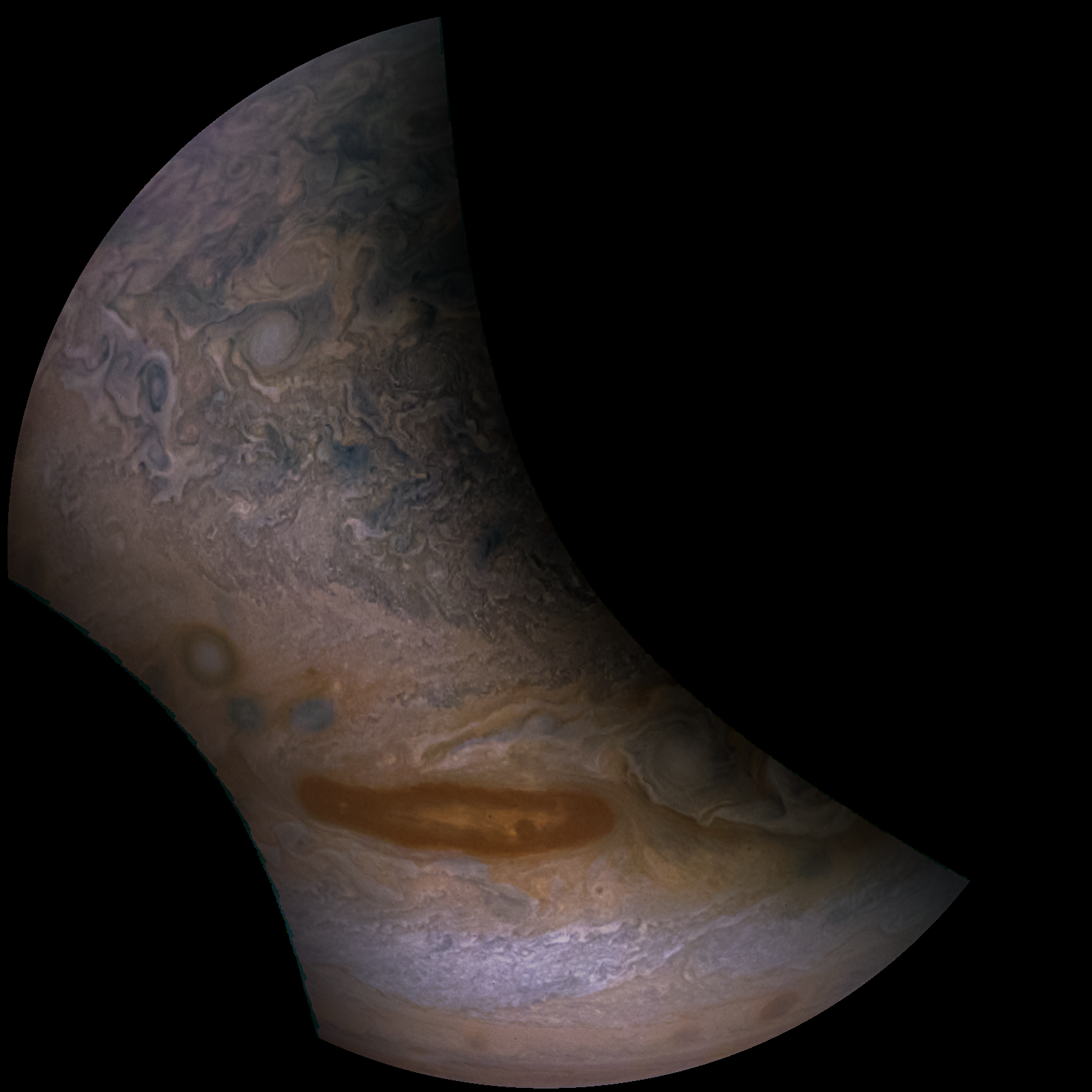 Junocam pixels are 12 bits deep from the camera but are converted to 8 bits inside the instrument using a lossless "companding" table, a process similar to gamma correction, to reduce their size. All Junocam products on the missionjuno website are in this 8-bit form as received on Earth. Scientific users interested in radiometric analysis should use the "RDR" data products archived with the Planetary Data System, which have been converted back to a linear 12-bit scale.