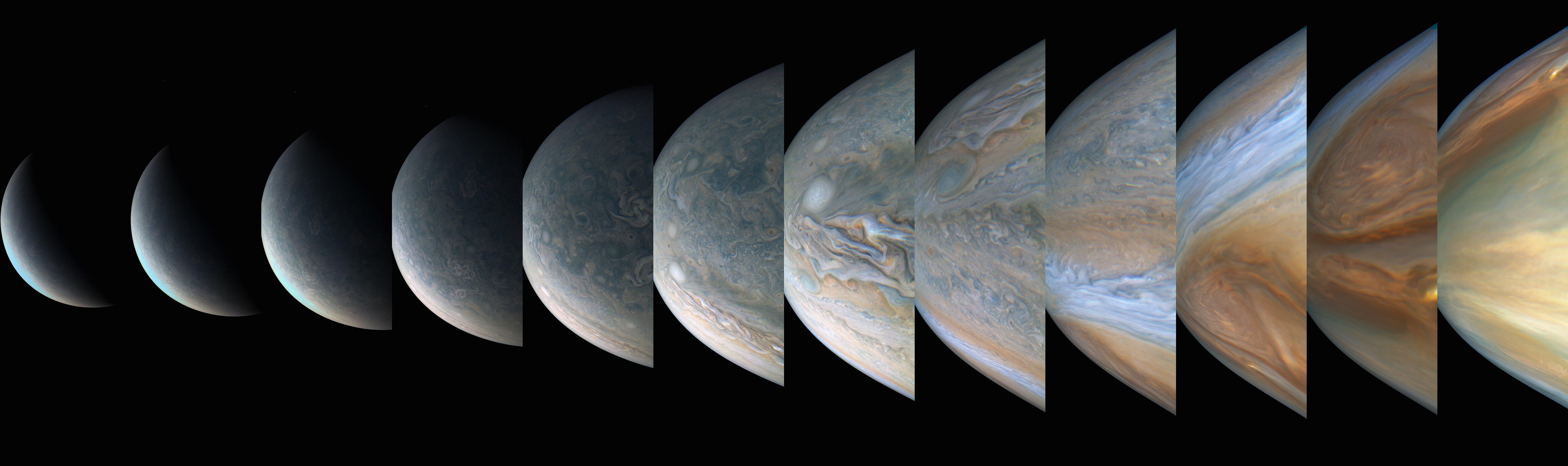 A special note about the Earth Flyby mission phase images: these were acquired in 2013 when Juno flew past Earth. Examples of processed images are shown; most contributions are from amateurs.