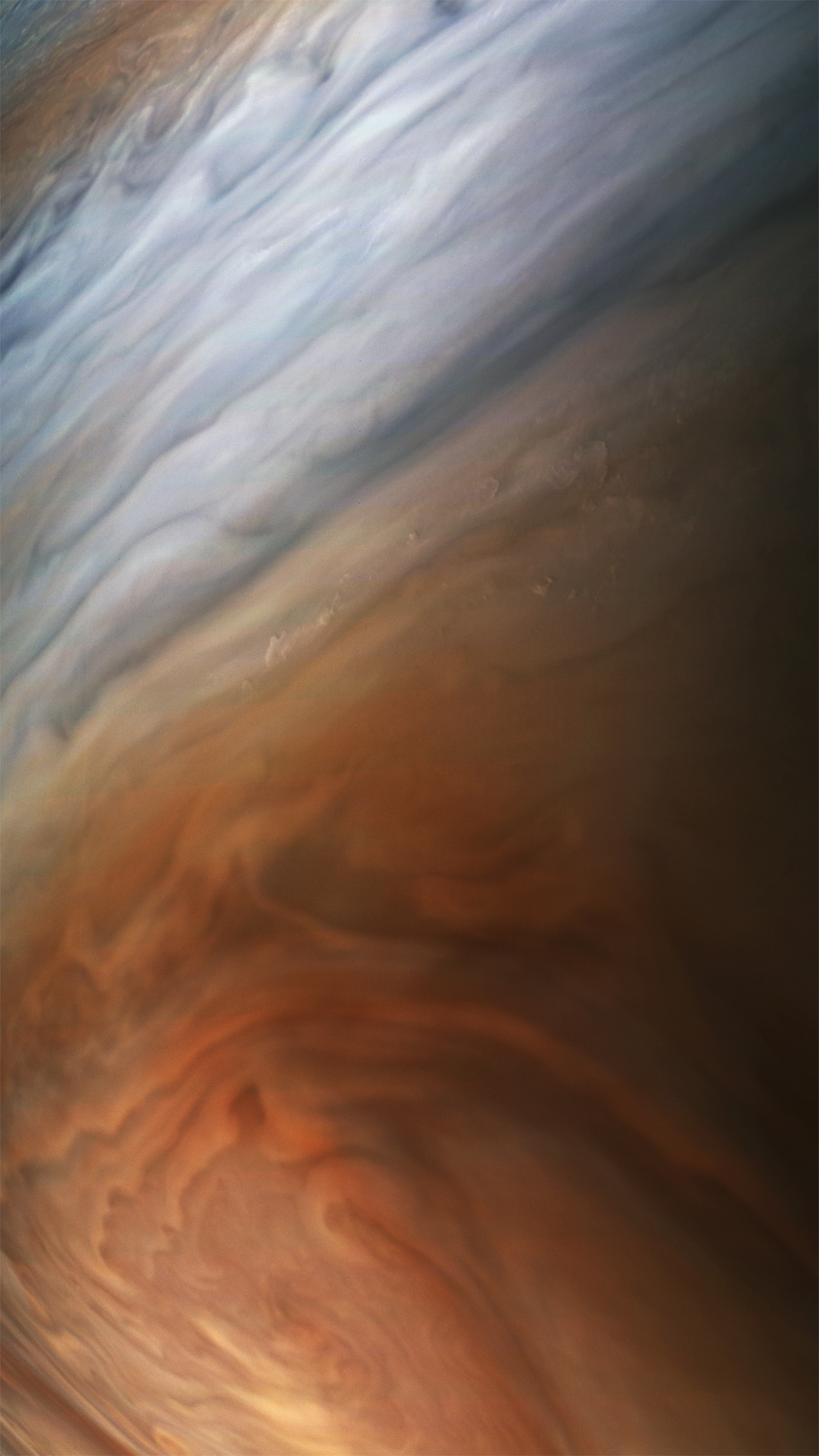 Junocam pixels are 12 bits deep from the camera but are converted to 8 bits inside the instrument using a lossless "companding" table, a process similar to gamma correction, to reduce their size. All Junocam products on the missionjuno website are in this 8-bit form as received on Earth. Scientific users interested in radiometric analysis should use the "RDR" data products archived with the Planetary Data System, which have been converted back to a linear 12-bit scale.