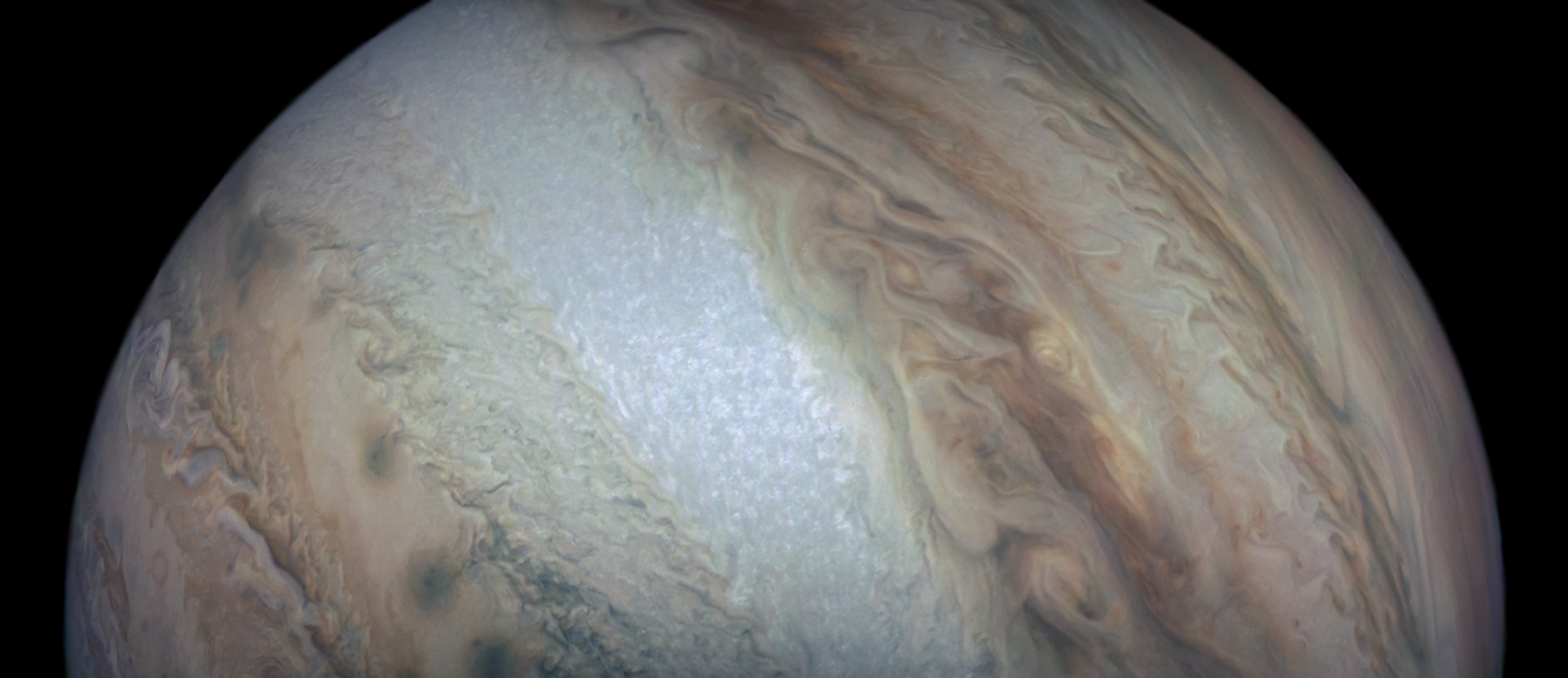 Junocam pixels are 12 bits deep from the camera but are converted to 8 bits inside the instrument using a lossless "companding" table, a process similar to gamma correction, to reduce their size. All Junocam products on the missionjuno website are in this 8-bit form as received on Earth. Scientific users interested in radiometric analysis should use the "RDR" data products archived with the Planetary Data System, which have been converted back to a linear 12-bit scale.