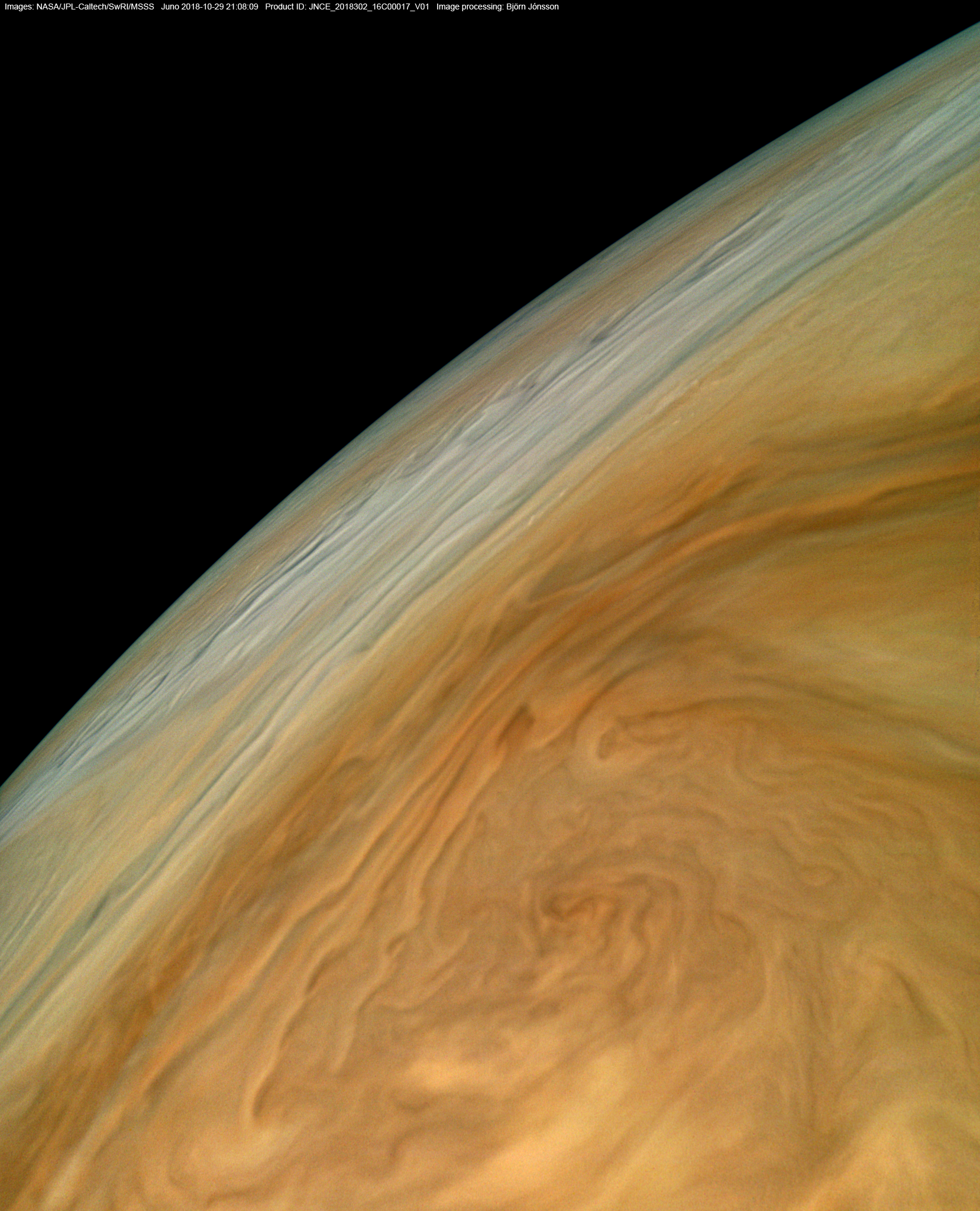An image processed from the PJ16_17 raw image framelets. The contrast/color has been exaggerated and small scale features sharpened.
