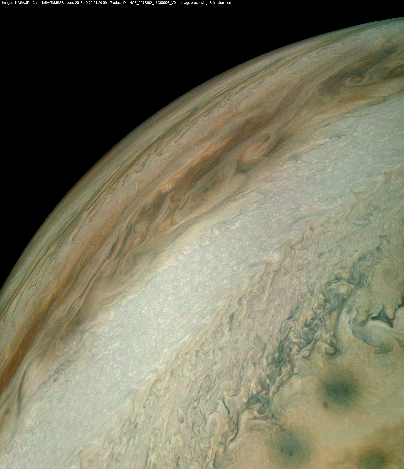An image processed from the PJ16_23 raw image framelets. The contrast/color has been exaggerated and small scale features sharpened.