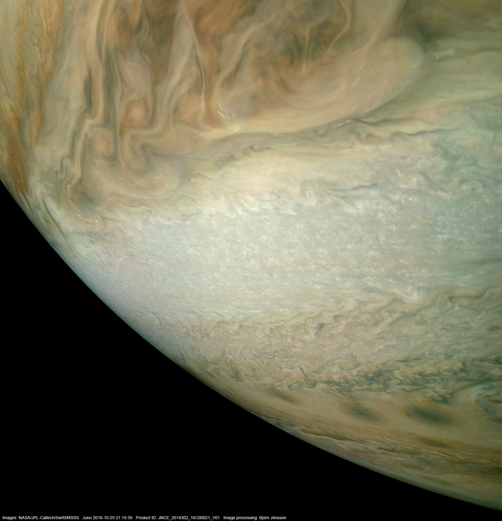 An image processed from the PJ16_21 raw image framelets. The contrast/color has been exaggerated and small scale features sharpened.