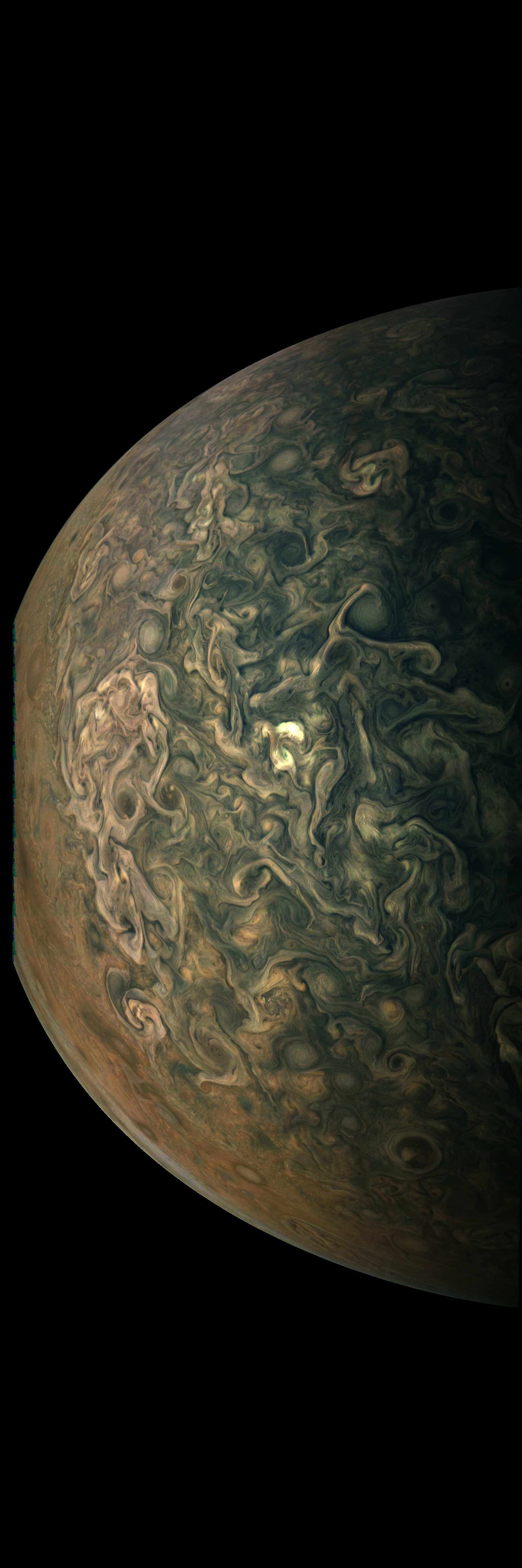 Resolution is 30 pixels per degrees in an equidistant cylindrical system centered to the camera at image stop time, with an axis parallel to Juno's spin axis. The rendered field of view is 60x180 degrees.