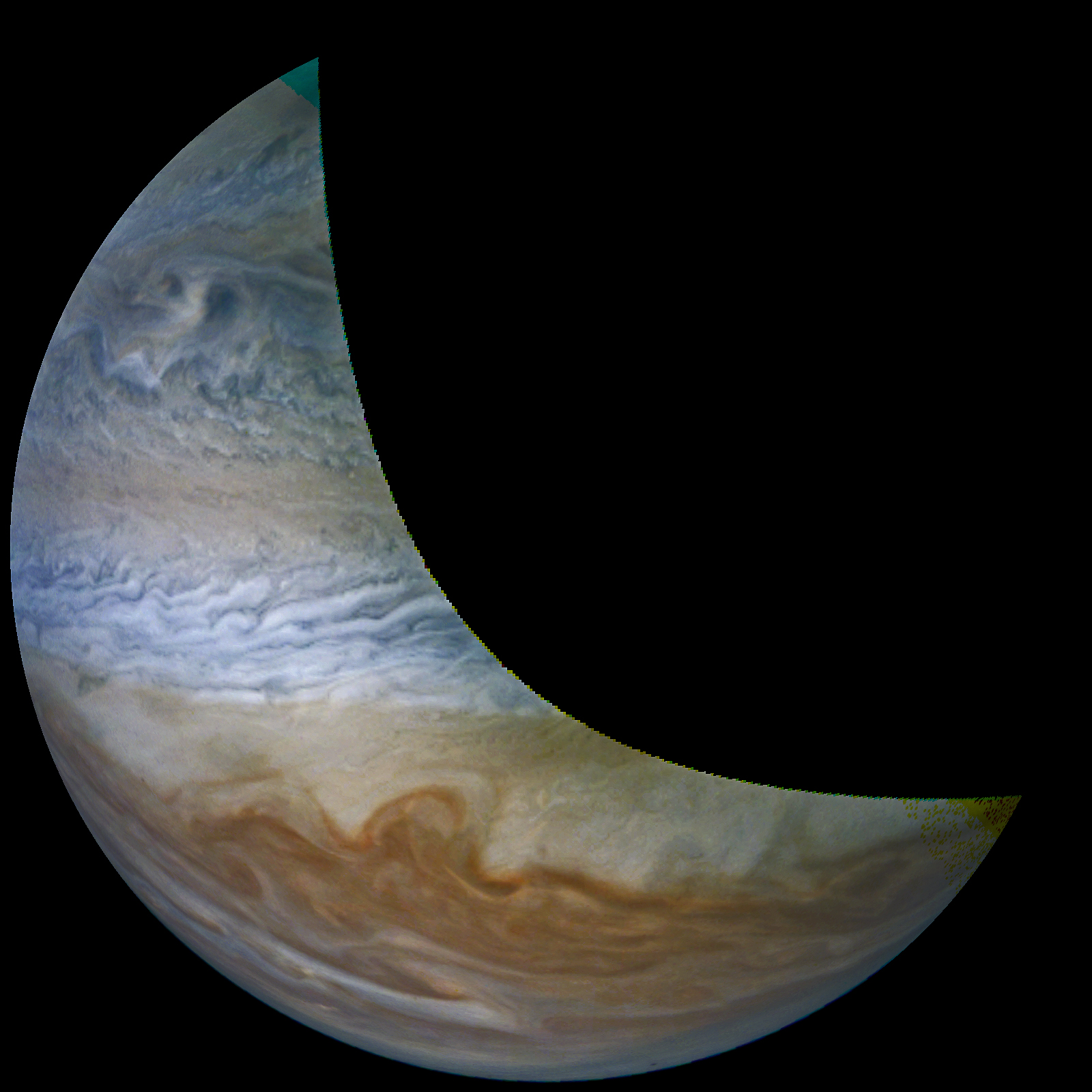 Junocam pixels are 12 bits deep from the camera but are converted to 8 bits inside the instrument using a lossless "companding" table, a process similar to gamma correction, to reduce their size. All Junocam products on the missionjuno website are in this 8-bit form as received on Earth. Scientific users interested in radiometric analysis should use the "RDR" data products archived with the Planetary Data System, which have been converted back to a linear 12-bit scale.