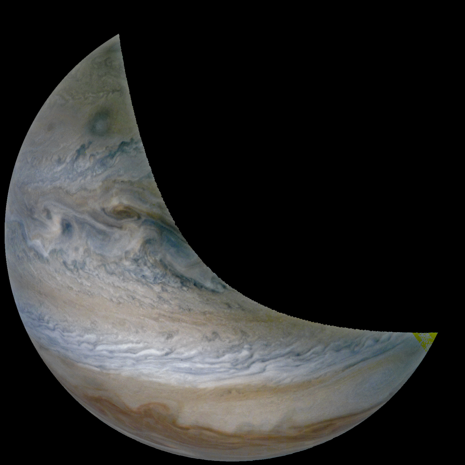 Junocam pixels are 12 bits deep from the camera but are converted to 8 bits inside the instrument using a lossless "companding" table, a process similar to gamma correction, to reduce their size. All Junocam products on the missionjuno website are in this 8-bit form as received on Earth. Scientific users interested in radiometric analysis should use the "RDR" data products archived with the Planetary Data System, which have been converted back to a linear 12-bit scale.