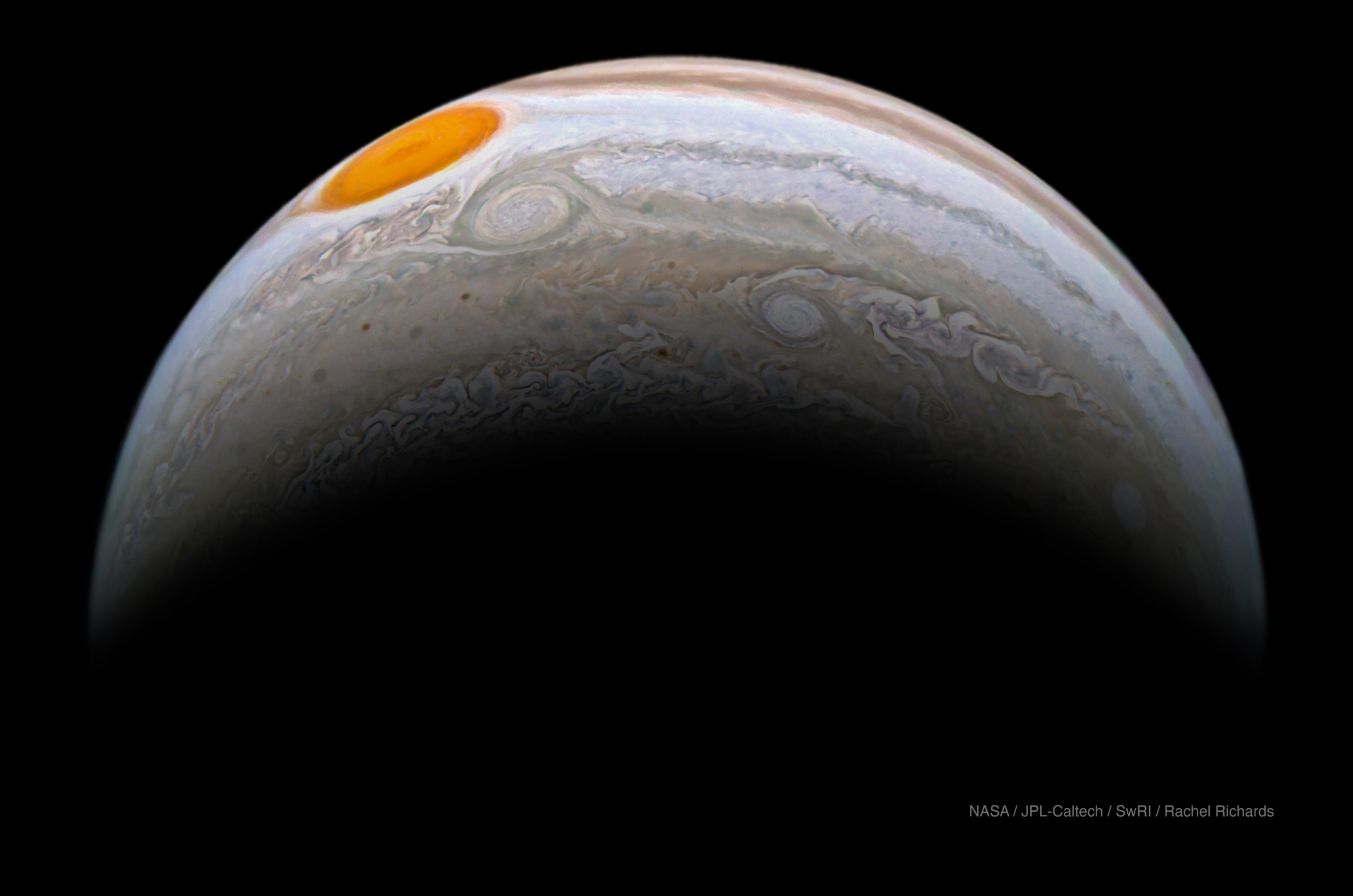 The south, south temperate belt of Jupiter as captured by JunoCam on December 21, 2018 during mission phase PERIJOVE 17. Image processed by Rachel Richards (@Docr0cket)