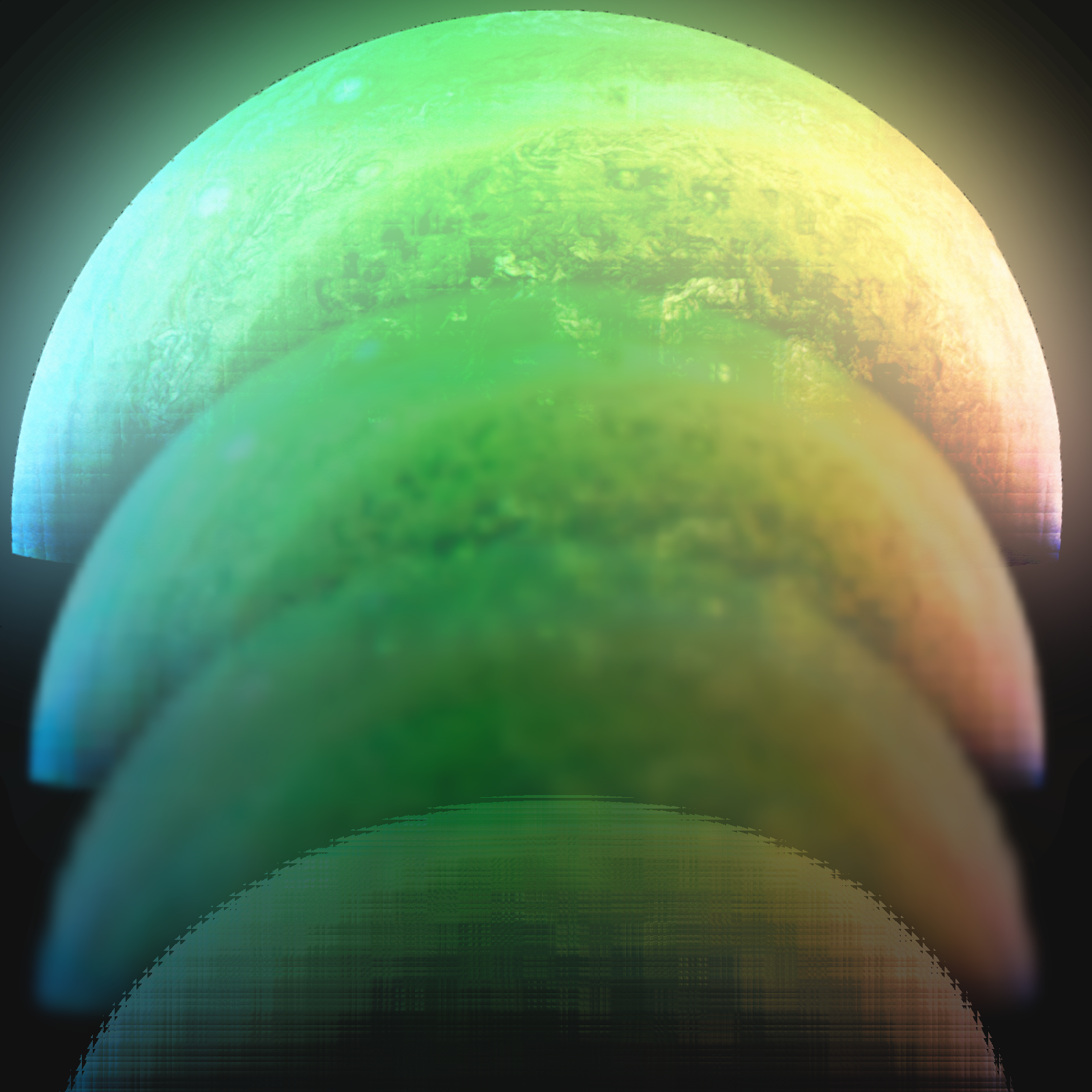 Junocam pixels are 12 bits deep from the camera but are converted to 8 bits inside the instrument using a lossless "companding" table, a process similar to gamma correction, to reduce their size. All Junocam products on the missionjuno website are in this 8-bit form as received on Earth. Scientific users interested in radiometric analysis should use the "RDR" data products archived with the Planetary Data System, which have been converted back to a linear 12-bit scale.