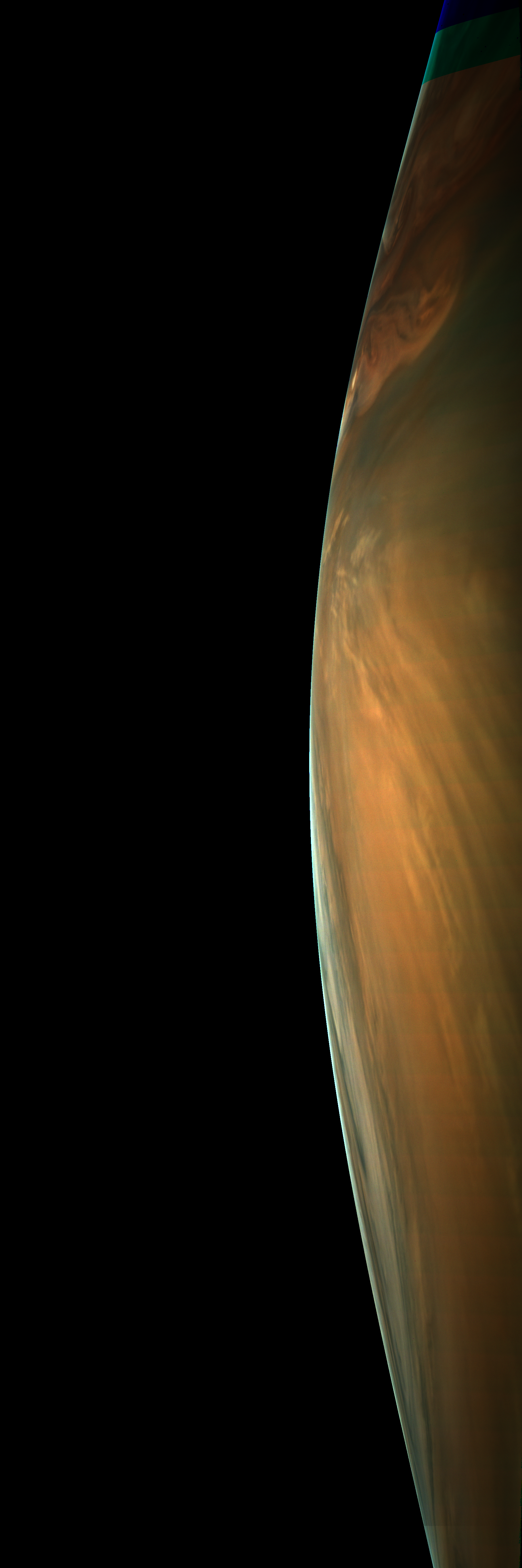 Resolution is 30 pixels per degrees in an equidistant cylindrical system centered to the camera at image stop time, with an axis parallel to Juno's spin axis. The rendered field of view is 60x180 degrees.