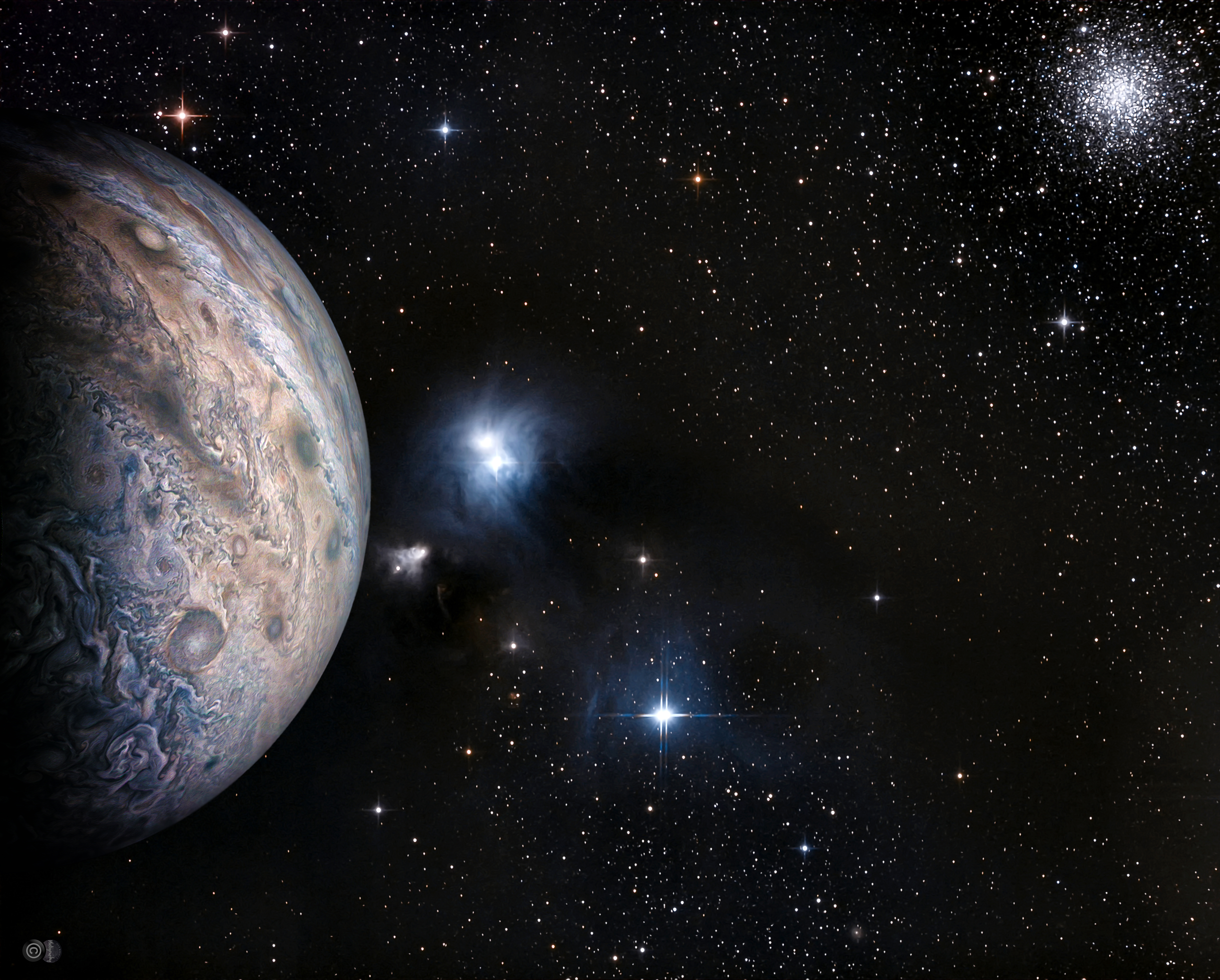 An artistic illustration of potential. In the background you have NGC6729. Here you have starbirth with emission nebula. Dark stellar dust is reflecting light from local stars. Travel approx. 424 light years from NGC6729 to our solar system and you have Jupiter. Jupiter being a large ball of gas and liquid, formed from stellar material, but not reaching a point of fusion. Jupiter could of been a star with a bit more mass. In it's current form Jupiter shows off it's dynamic molecular mix that is ever-changing on it's surface.