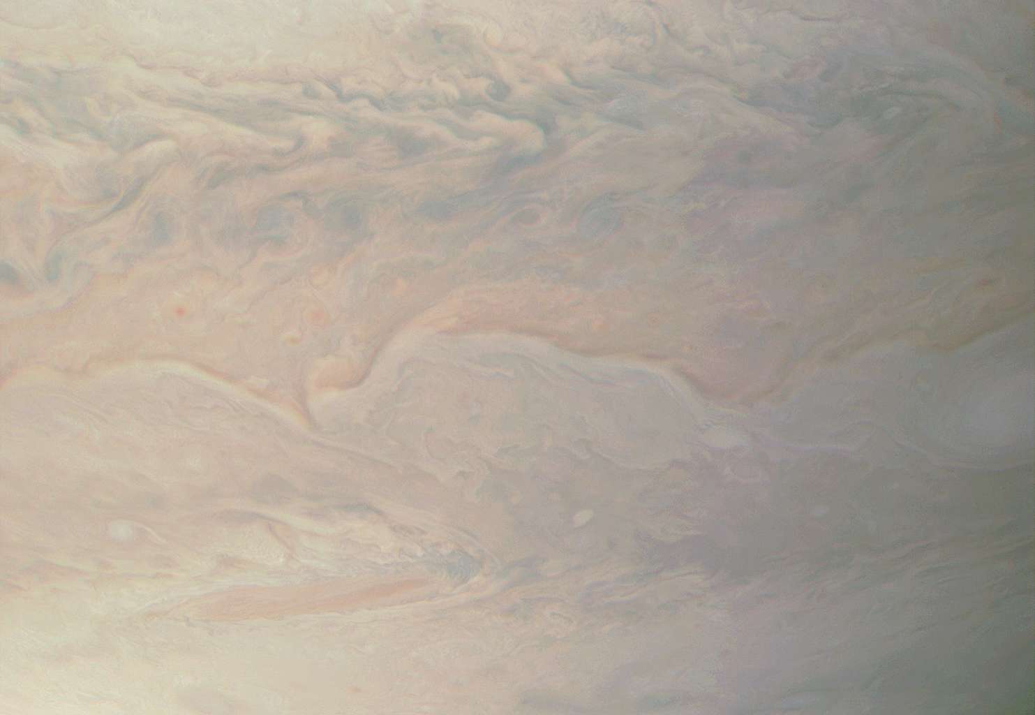 Junocam pixels are 12 bits deep from the camera but are converted to 8 bits inside the instrument using a lossless "companding" table, a process similar to gamma correction, to reduce their size. All Junocam products on the missionjuno website are in this 8-bit form as received on Earth. Scientific users interested in radiometric analysis should use the "RDR" data products archived with the Planetary Data System, which have been converted back to a linear 12-bit scale.
