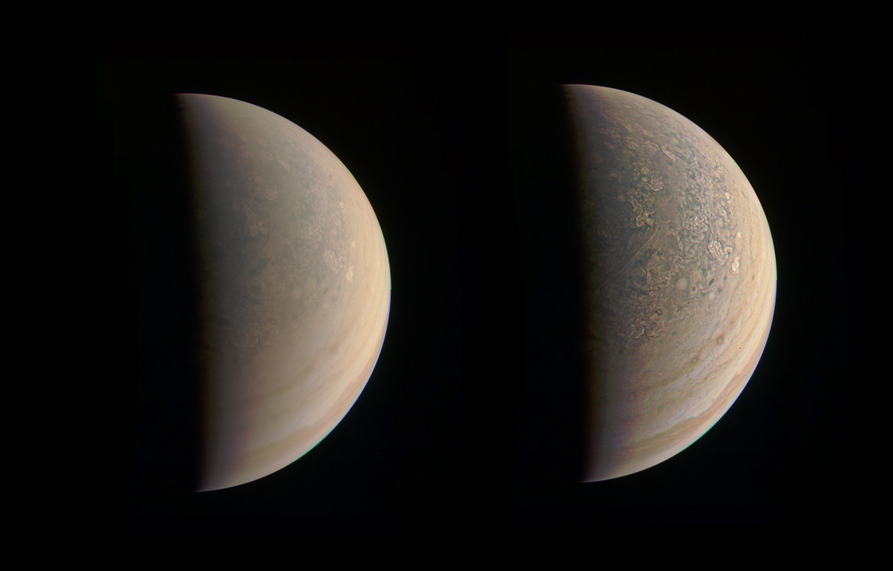 Assembled from Junocam frame JNCE_2016240_00C6159_V01. Assembled in Adobe Photoshop CS5. The left version is simply color corrected, while the right uses multiple high-pass filtering layers to bring out detail from the pole to the limb.