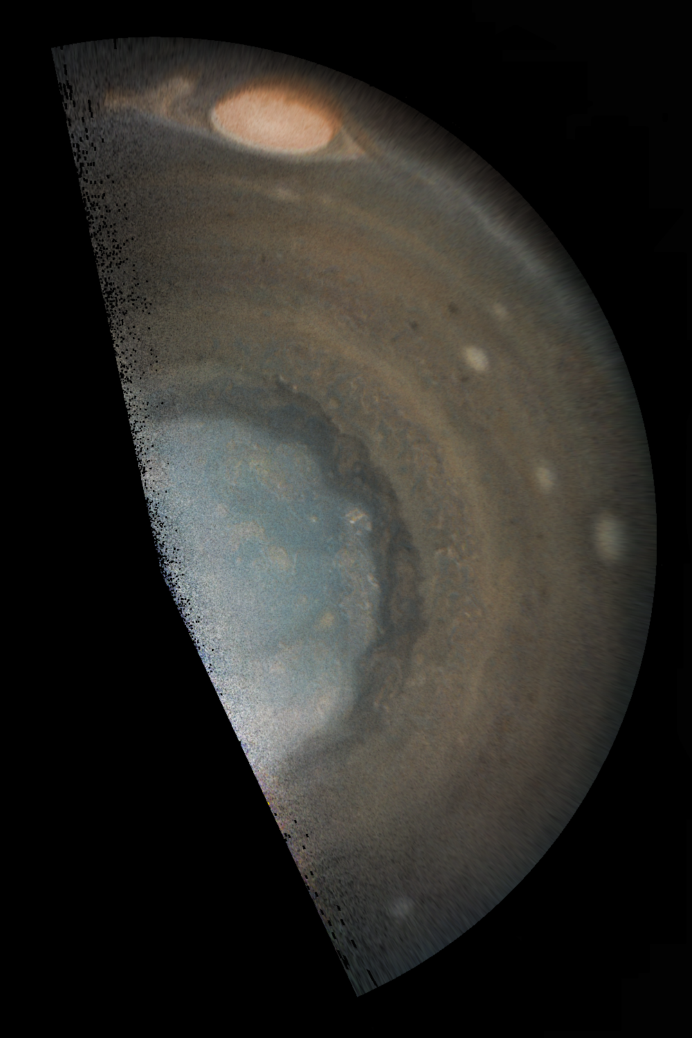 This cropped south polar azimuthal equidistant planetocentric map combines data from a PJ19 RGB image, and from several methane band images. Hue and saturation are taken from the RGB image, brighntess is taken from the combined methane band image. Since methane band brightess correlates to the height of the cloud tops and hazes, bright features are reaching higher into the atmosphere. Those are especially the polar haze, and the haze above the Great Red Spot (GRS), but also some areas on smaller anticyclones, and along the turbulent zone on the latitude range of the GRS. Smaller-scale methane-bright features appear to correlate with Folded Filamentary Regions (FFRs).