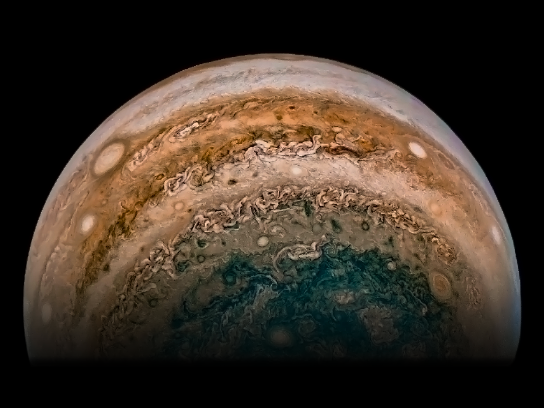 Processed image of Jupiter using the JunoCam imager's PJ19 Southern Timelapse Sequence raw images and data from NASA's Juno spacecraft flyby on April 6, 2019. Enhanced to showcase the beautiful details and colourful swirling clouds of Jupiter. Artist's impression – not representative of true colour.