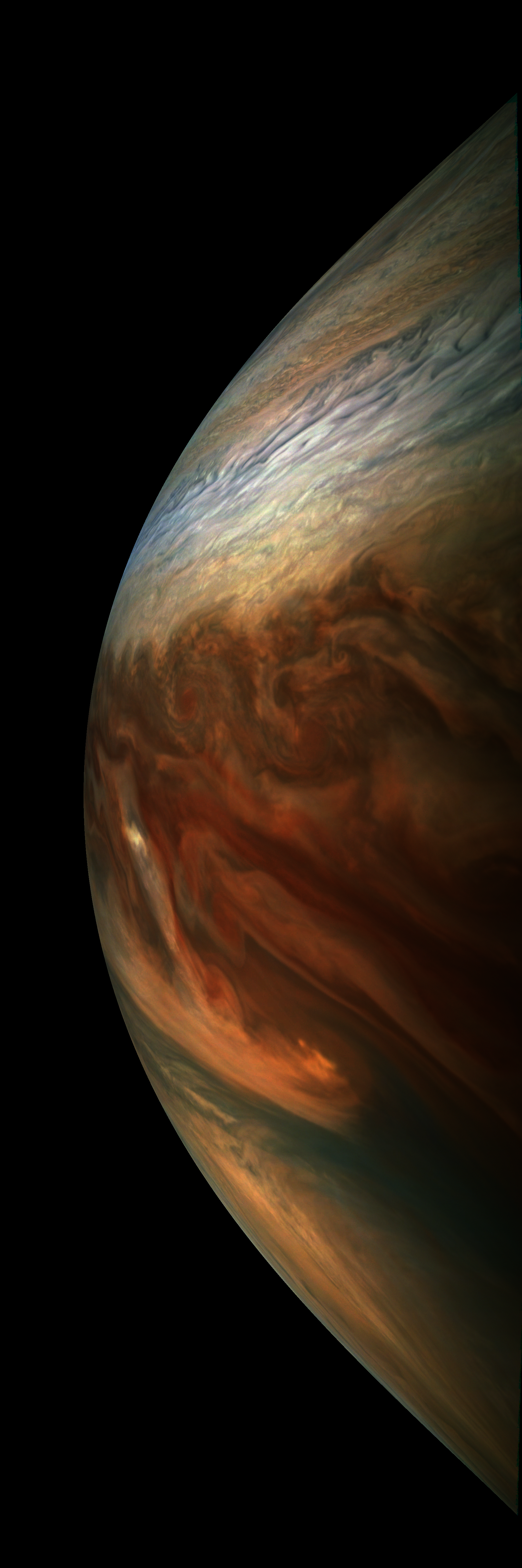 Junocam pixels are 12 bits deep from the camera but are converted to 8 bits inside the instrument using a lossless "companding" table, a process similar to gamma correction, to reduce their size. All Junocam products on the missionjuno website are in this 8-bit form as received on Earth. Scientific users interested in radiometric analysis should use the "RDR" data products archived with the Planetary Data System, which have been converted back to a linear 12-bit scale.