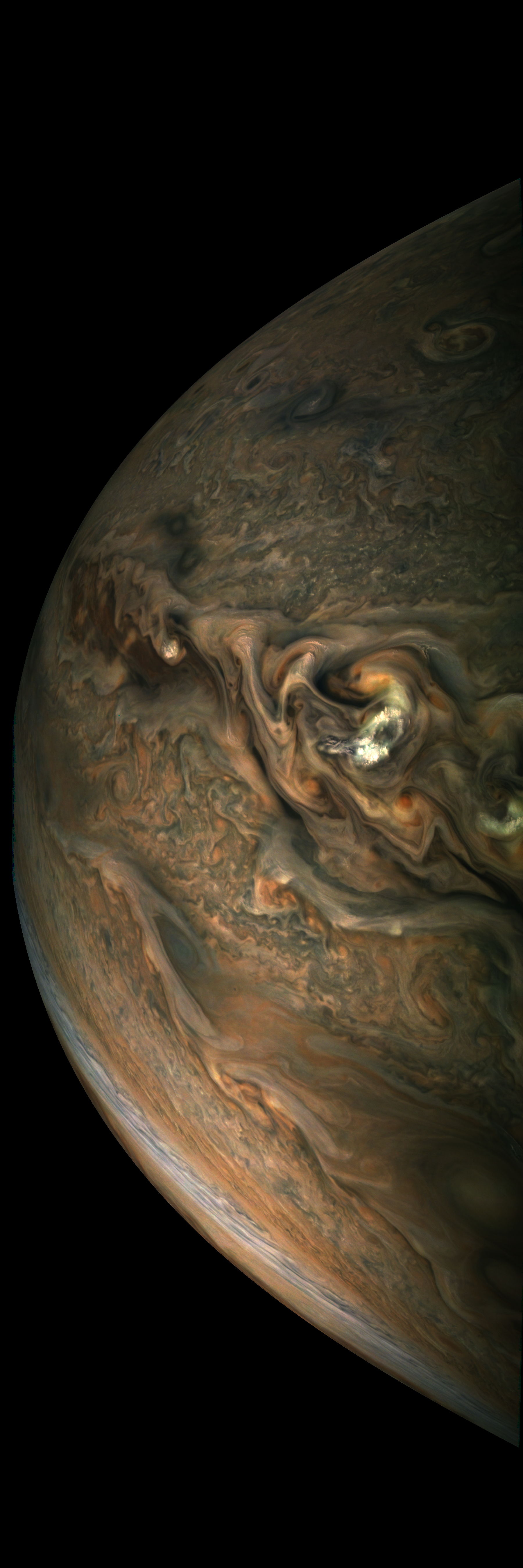 Junocam pixels are 12 bits deep from the camera but are converted to 8 bits inside the instrument using a lossless "companding" table, a process similar to gamma correction, to reduce their size. All Junocam products on the missionjuno website are in this 8-bit form as received on Earth. Scientific users interested in radiometric analysis should use the "RDR" data products archived with the Planetary Data System, which have been converted back to a linear 12-bit scale.