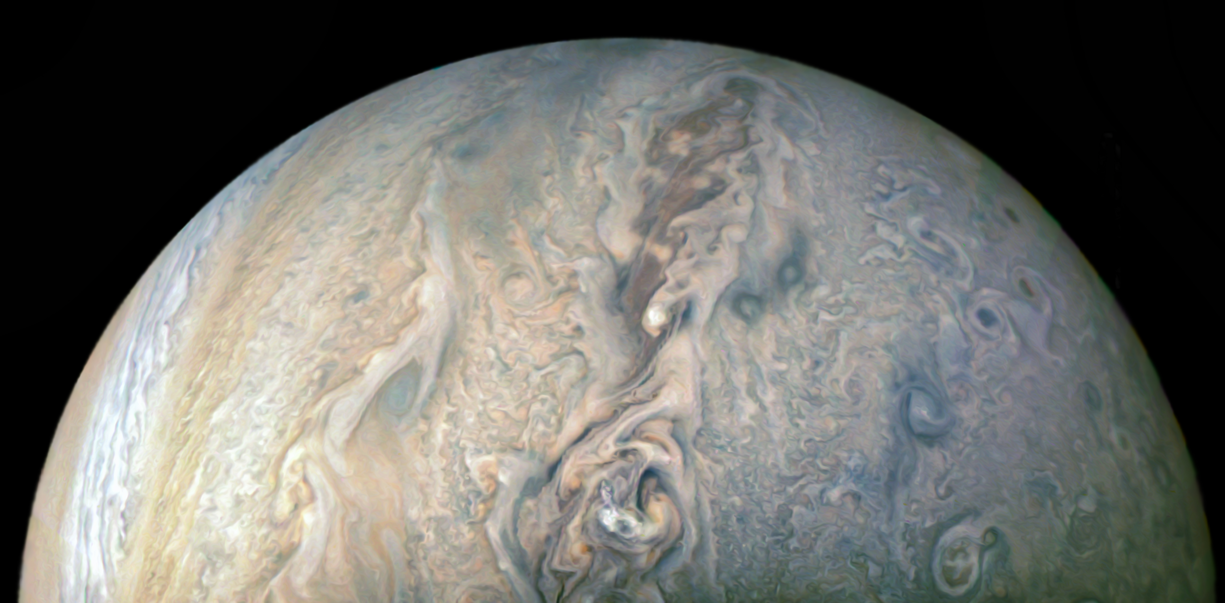 Junocam pixels are 12 bits deep from the camera but are converted to 8 bits inside the instrument using a lossless "companding" table, a process similar to gamma correction, to reduce their size. All Junocam products on the missionjuno website are in this 8-bit form as received on Earth. Scientific users interested in radiometric analysis should use the "RDR" data products archived with the Planetary Data System, which have been converted back to a linear 12-bit scale.
