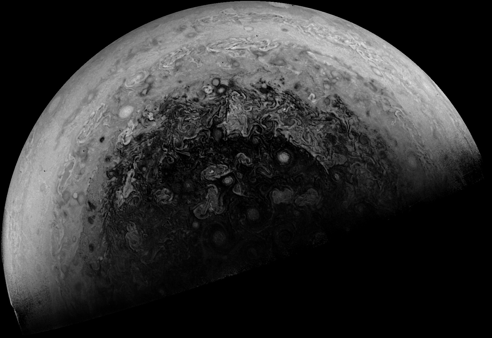 Junocam pixels are 12 bits deep from the camera but are converted to 8 bits inside the instrument using a lossless "companding" table, a process similar to gamma correction, to reduce their size. All Junocam products on the missionjuno website are in this 8-bit form as received on Earth. Scientific users interested in radiometric analysis should use the "RDR" data products archived with the Planetary Data System, which have been converted back to a linear 12-bit scale.